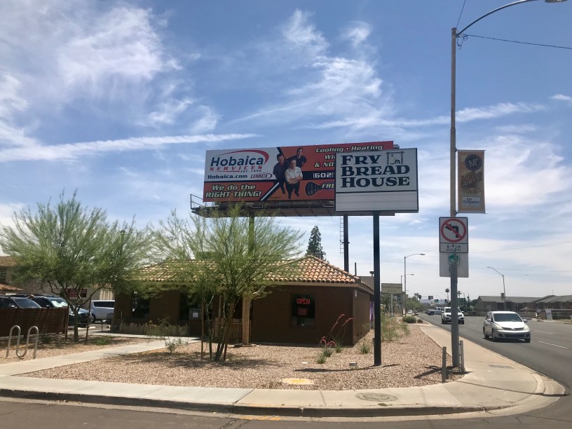 The Fry Bread House’s current location is indeed a house, or at least it looks as though it once was. It’s a standalone structure at the corner of 7th Avenue and Hazelwood, just a block north of the canal. A bike rack is found at the front door facing Hazelwood; that door is currently closed due to a take-out arrangement maintained from the side door facing the parking lot. Likewise, the two small dining rooms, simply decorated but full of natural light, are temporarily closed due to public health concerns.