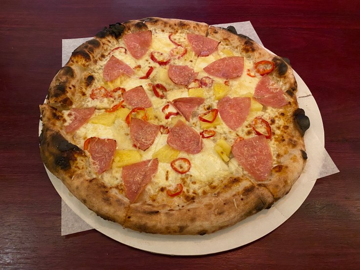 Myke’s pineapple pizza dispenses with any references to Hawaii and uses pork roll, a New Jersey tradition, instead of ordinary ham. Pickled chilies and spicy honey add a bit of spice to contrast with the meaty and fruity tastes on the pizza. The pie embraces the controversy over putting pineapple on pizza and proves just how successful the topping can be. Another unexpected pizza topping is potato, in which small chunks are paired with bits of bacon and garlic cream. An occasional variant adds red sauce to the white pie permanently on the menu.