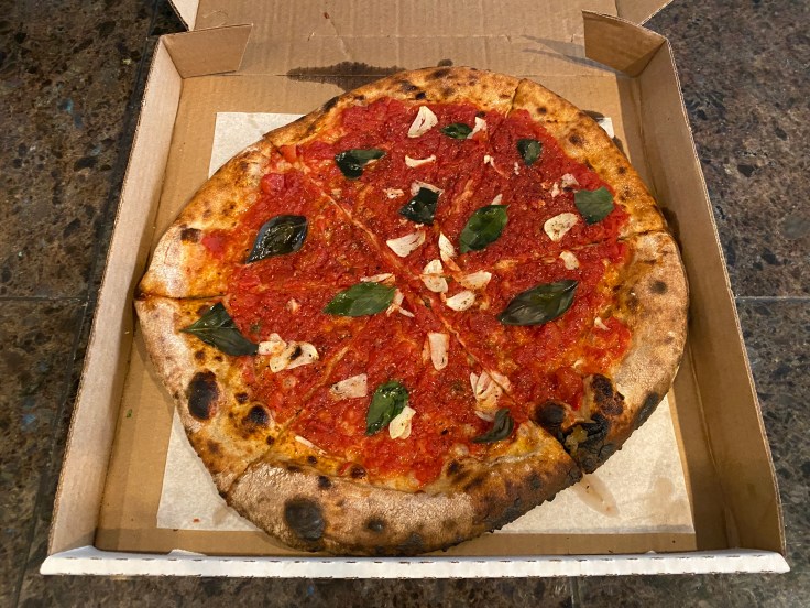 The test of any pizzeria is how it fares with simple classics in which ingredient quality and care of preparation become apparent. Myke’s margherita, like nearly all the pies, tops a base of mozzarella with aged gouda, a distinctive touch that adds a subtle and slightly nutty note to the creamier layer beneath. A sauce of crushed tomatoes with fresh basil and olive oil completes the pizza, although a complimentary dusting of cracked pepper helps to accentuate the combination of flavors. Take away the cheese, and the result is a tomato pie, or marinara pizza.