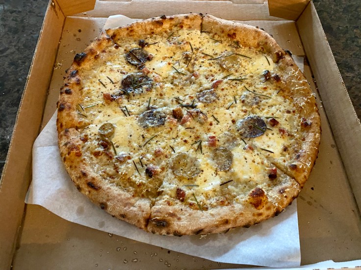 With the move to an indoor location, Myke’s was able to upgrade its operation to a fully equipped kitchen with a wood-fired oven, but the crust of these pies was already consistently successful even when they were cooked with gas on the sidewalk. The pizza is Neapolitan style with a crust that is thick and chewy towards the edge, thin and just a bit floppy in the center, airy and pliable on the inside, and blistered with a slight char on the bottom. The 12-inch pies are sized for one hungry person to enjoy or two people to share if paired with a salad or appetizer.