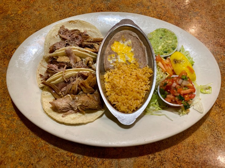 Even more expansive are the parrilladas, platters of mixed meats and seafood served over canned heat to maintain their temperature and designed to be shared among two or more people at a table. When it comes to its meat selections, Comedor Guadalajara’s carnitas are clearly the most indulgent choice. The menu is accurate but unusually frank in describing the dish as “deep fried pork,” and the carnitas make a rich, satisfying filling for the taquitos suaves, a combination entree incorporating three soft tacos on a platter with rice and beans.
