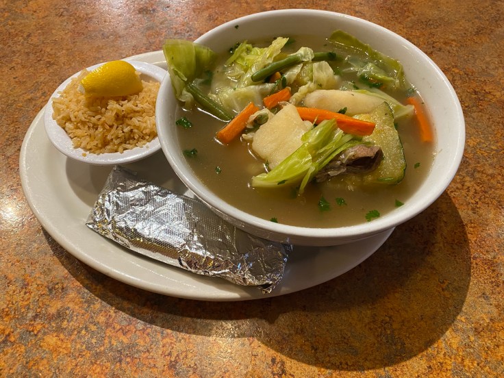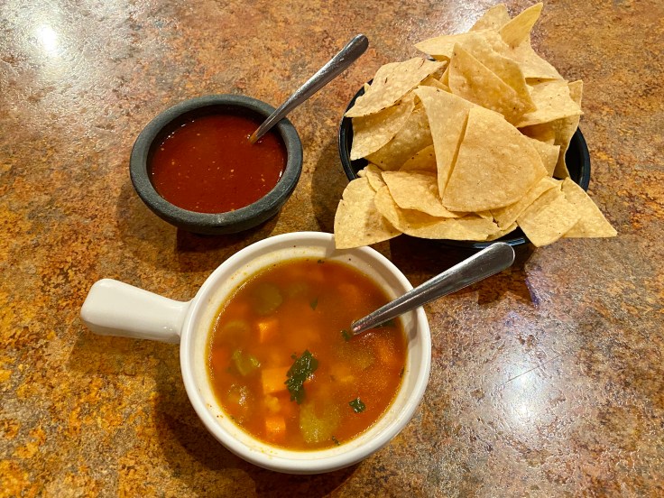 Once the wait is over and customers are at their tables, there’s an extensive menu to be studied, along with a few specials listed on whiteboards near the kitchen. While that reading occurs, diners receive a basket of chips and a red salsa for dipping. Unlike at some local restaurants, there is no semi-secret hotter salsa available by request, but the standard one has a pleasing moderate burn. Starting around 11 AM, there’s an additional complementary starter of a small cup of a simple soup containing fideo pasta in chicken broth with minced vegetables.