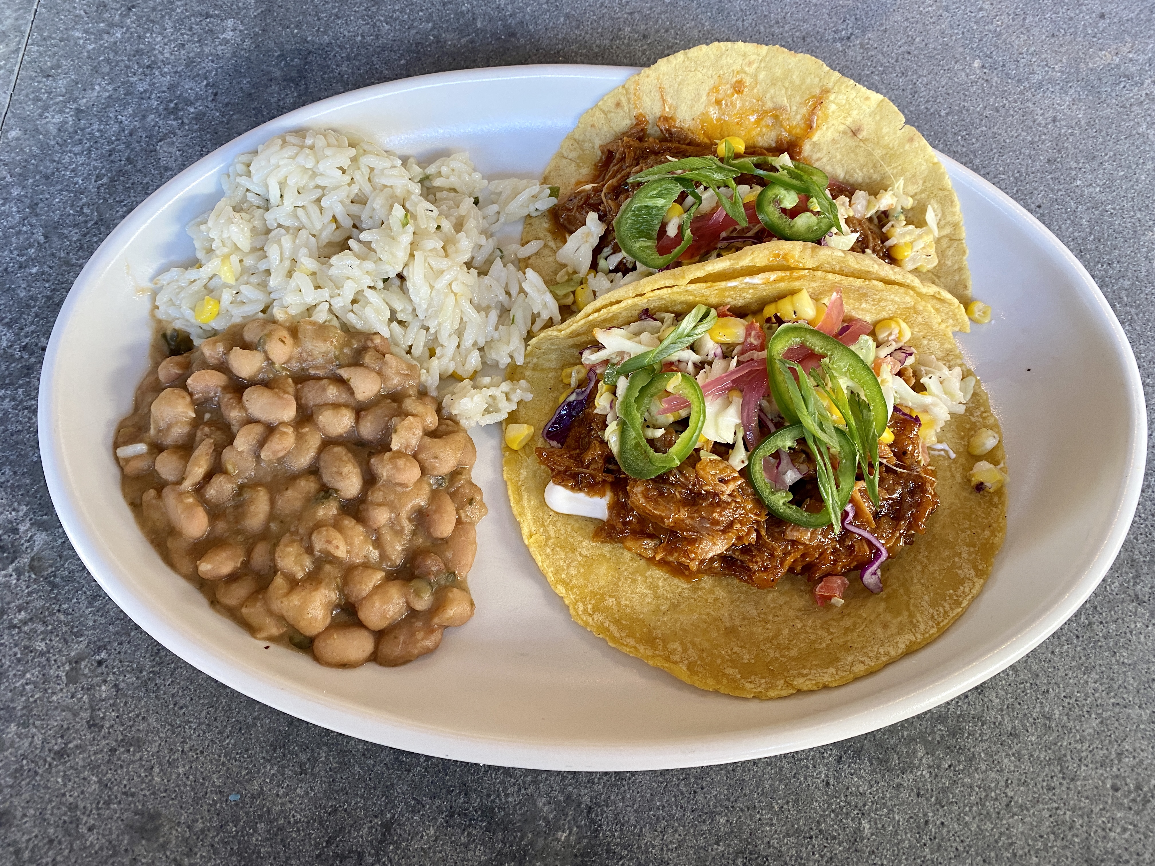 Additional taco fillings include short rib machaca, red chile chicken, grilled avocado, mahi mahi, carne asada, and ground beef. The last choice is served, as expected, in hard shells. The rest are in soft corn tortillas. All tacos are served in plated meals of two large tacos, a choice of black or charro beans, and a side of rice. The rice at Blanco is its own style. It’s not plain grains, but it’s also not the familiar golden-tinged “Spanish rice” served in so many local Mexican restaurants. Instead, it might be seen as something halfway between risotto and a pilaf.