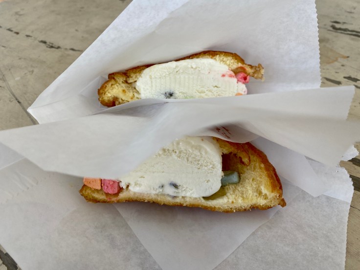Whether served in a cup or a waffle cone, any flavor can be topped with any number of sugary breakfast cereals or something as simple as rainbow sprinkles or chocolate sauce. For the next level of novelty at Novel, the signature dish is a dough melt, a scoop of ice cream inserted between two halves of a glazed donut. The sweet sandwich is gently pressed to yield a warm exterior and cool inner core. A companion offering is the Leslie Knope, named for the Parks and Recreation character’s affection for waffles. Both creations also involve a choice of topping.