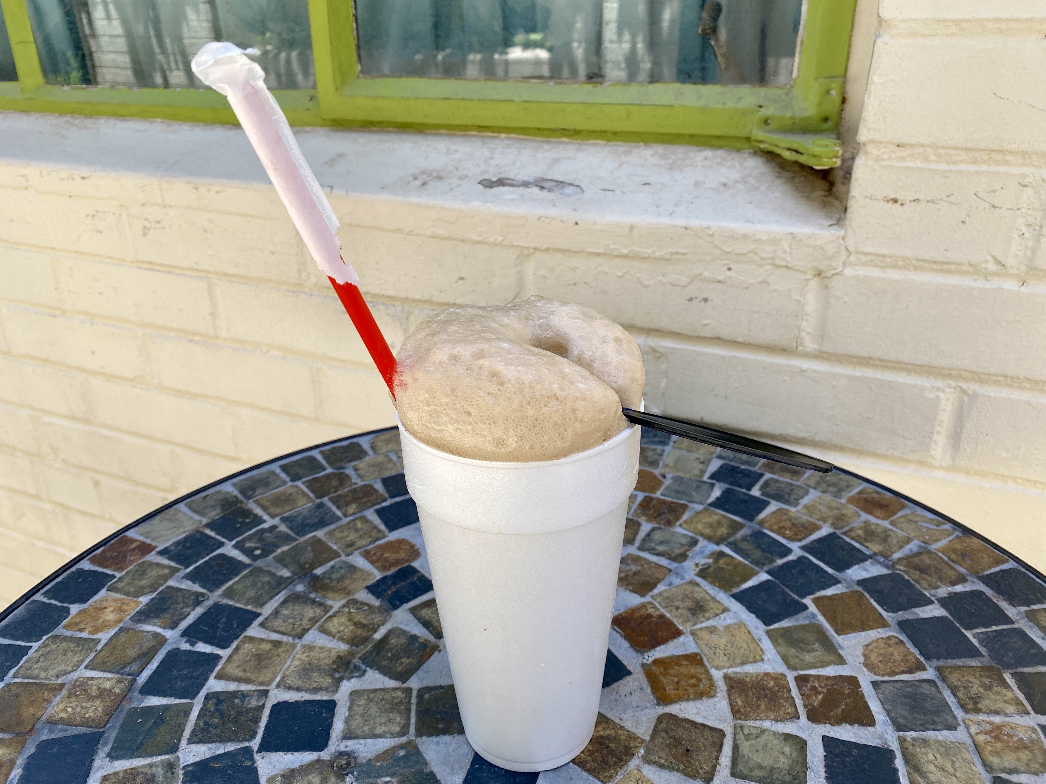 Near the end of the walkway, look for Novel on the left. As with Grand Avenue, the Mesa location operates as a retail window rather than a walk-in shop. A daily dozen flavors are listed on a sign, and a small menu describes how the frozen desserts can be ordered in cups, in cones, and in combination with donuts, waffles, or a bottled beverage in a float. Customers order at the window and wait a few minutes while their indulgences are prepared. Small tables are available in the breezeway with a larger picnic table on the sidewalk along MacDonald.