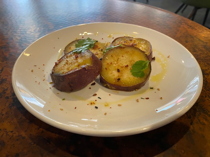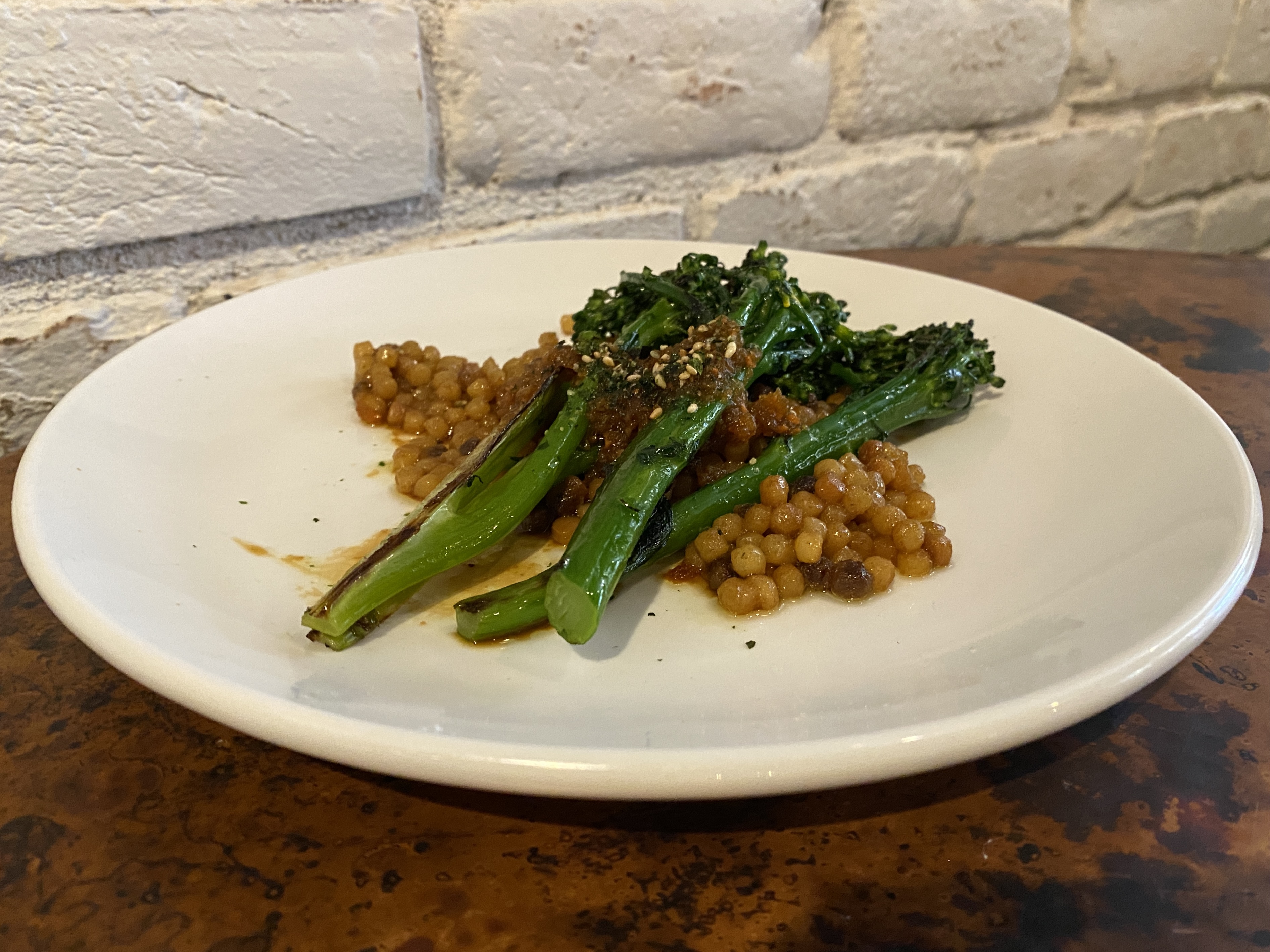 Produce, much of it sourced from local producers, is also a theme here. It’s often included on plated entrees or the rice bowl, but several vegetable dishes are offered a la carte to be shared as either tapas or side dishes. Japanese sweet potatoes are an ideal ingredient for roasting, which softens the texture while accentuating their gentle flavor. Flecks of cilantro and Aleppo chili add a little heat and complexity to the dish. Broccolini also benefits from the wood-fueled flame and is often topped with a little furikake and wafu and plated with more pearls of fregola.