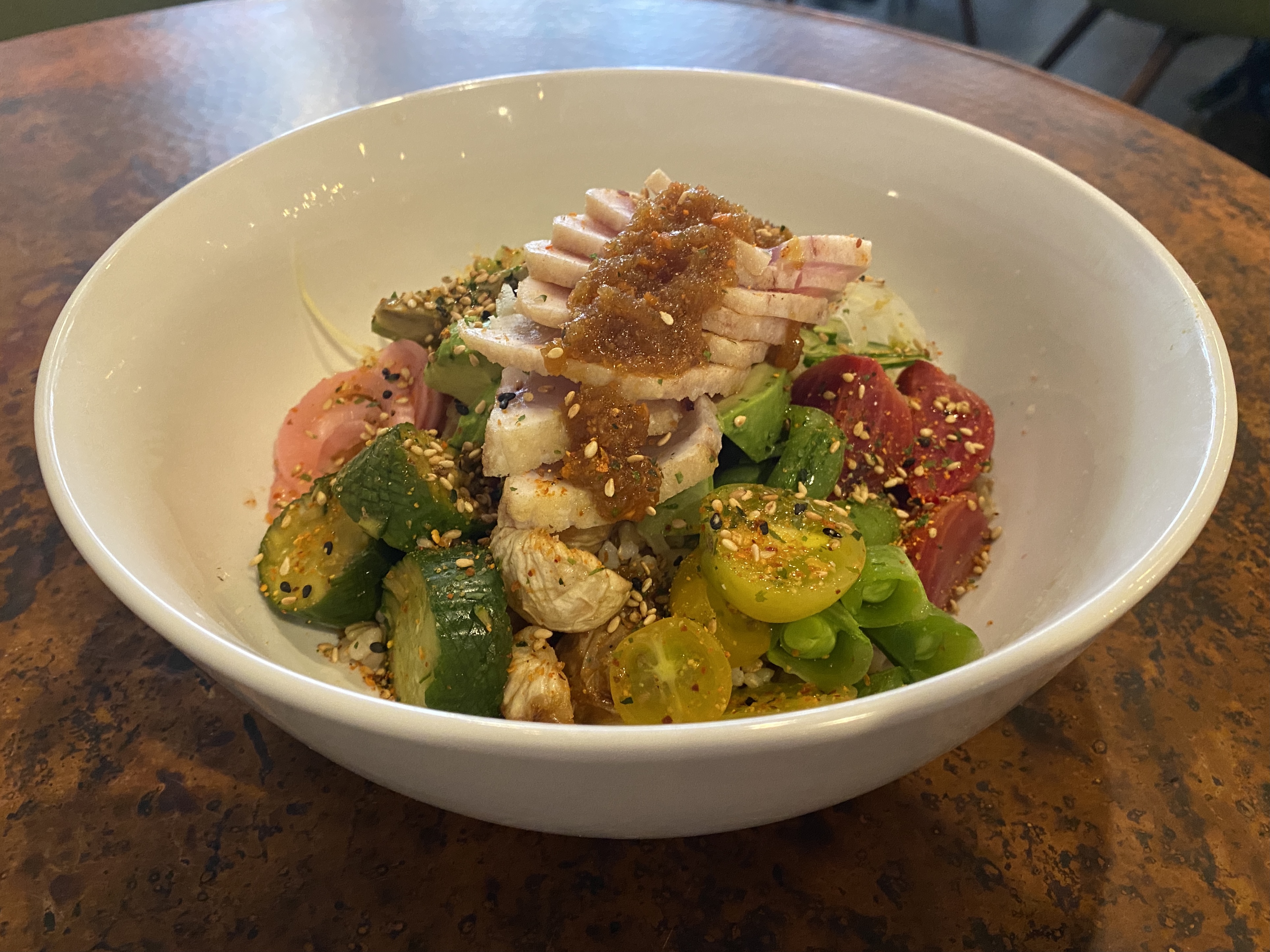 Seafood places a prominent role here. Usually, it’s a gently roasted piece of fish like halibut minimally seasoned and then paired with vegetables or a grain such as fregola, a chewy, nutty pasta similar in shape and size to Israeli couscous. In other cases, Sea of Cortez shrimp might be tossed with noodles or served in a salad. Fans of the 24th Street Pa’La might recall the restaurant’s signature Navarro bowl of grains. It’s not available downtown, but something similar is on the board: a brown rice bowl with toppings such as seared tuna, vegetables, and furikake.