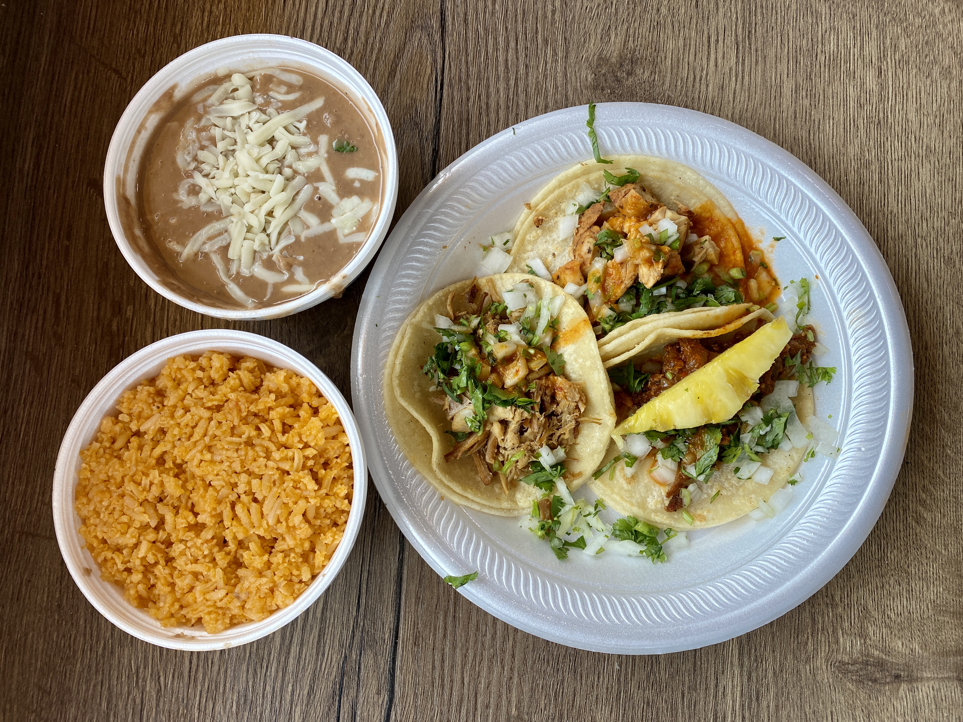 The restaurant is found on the west side of Central Avenue two blocks north of Broadway/Central station on the B Line. El Nuevo Taquito occupies a yellow/gold standalone building with red accents. Outside, there’s the promising sign of an outdoor grilling station. Customers who arrive at the right time may see a member of the staff tending some meat there, with the resulting smoke carrying an enticing aroma down the block. The interior has red-and-yellow chairs and posters devoted to boxing.
