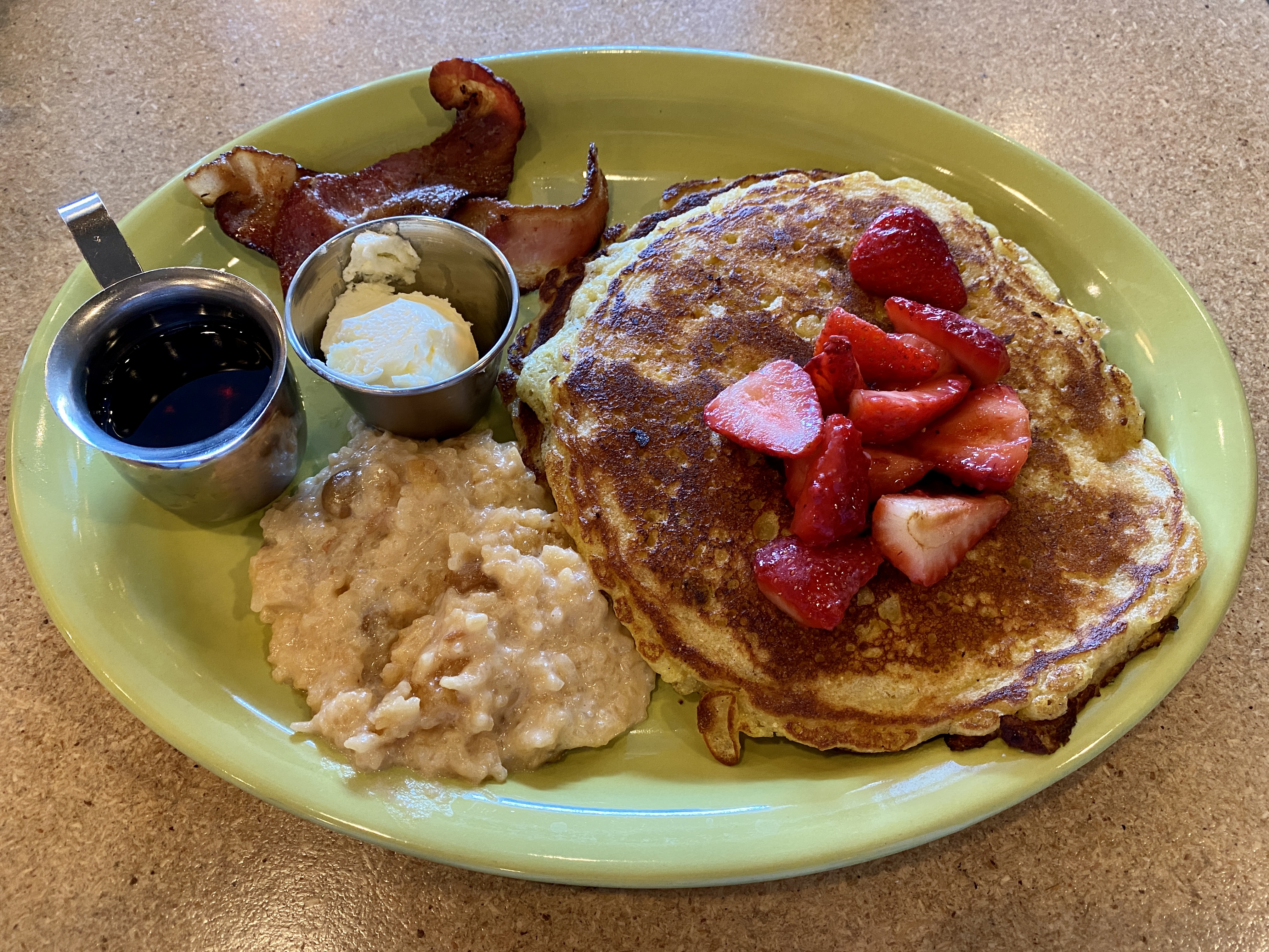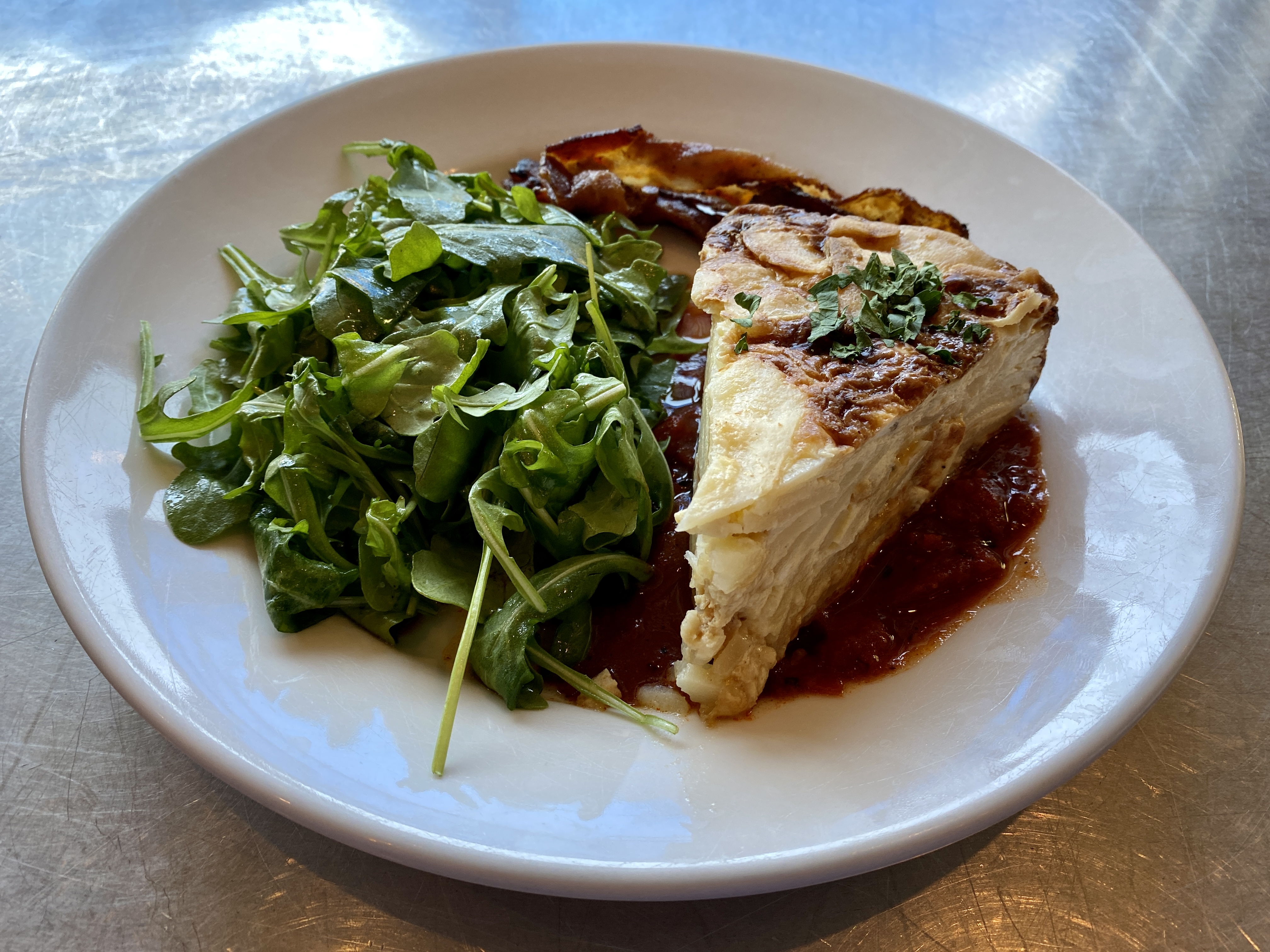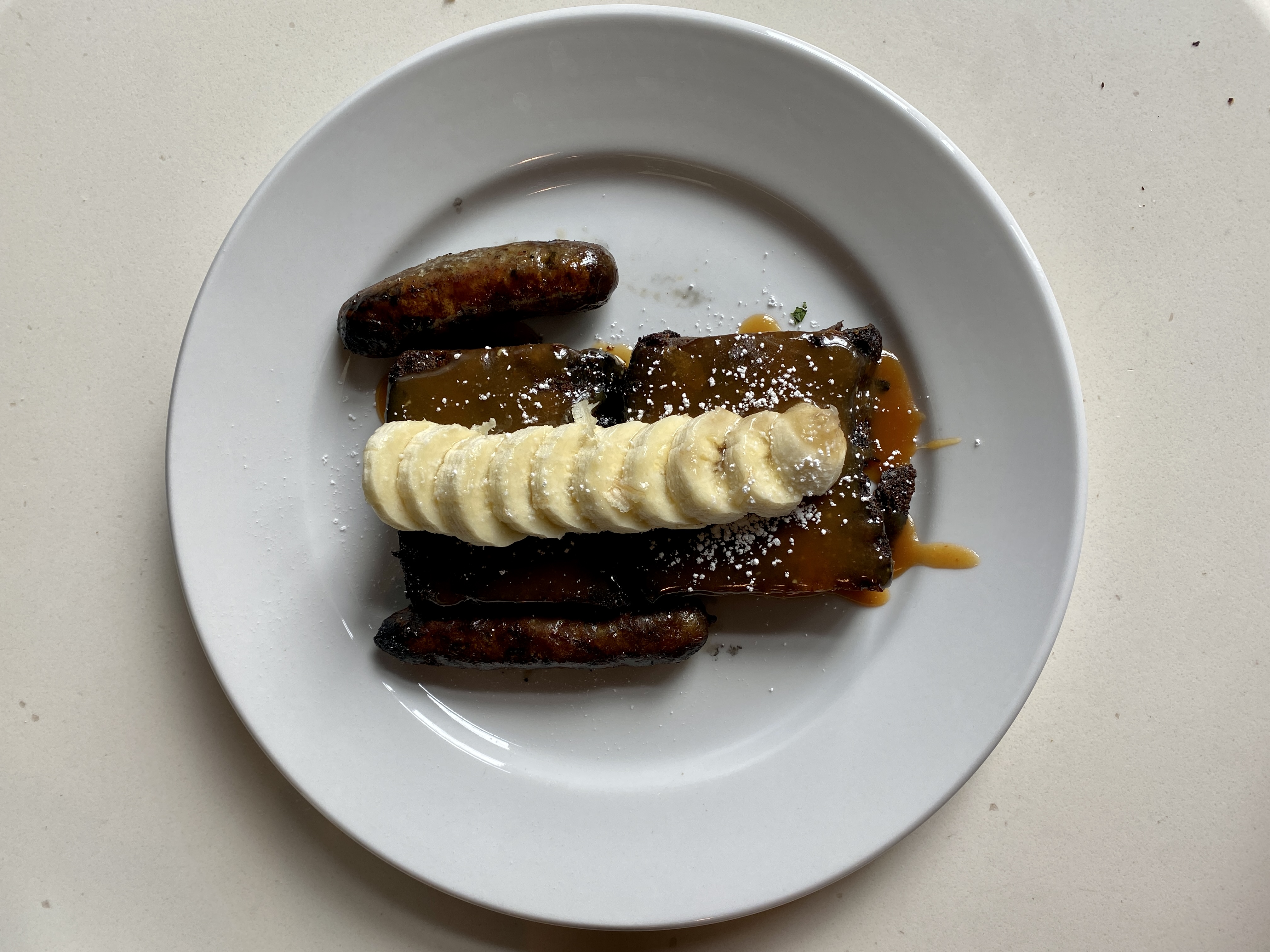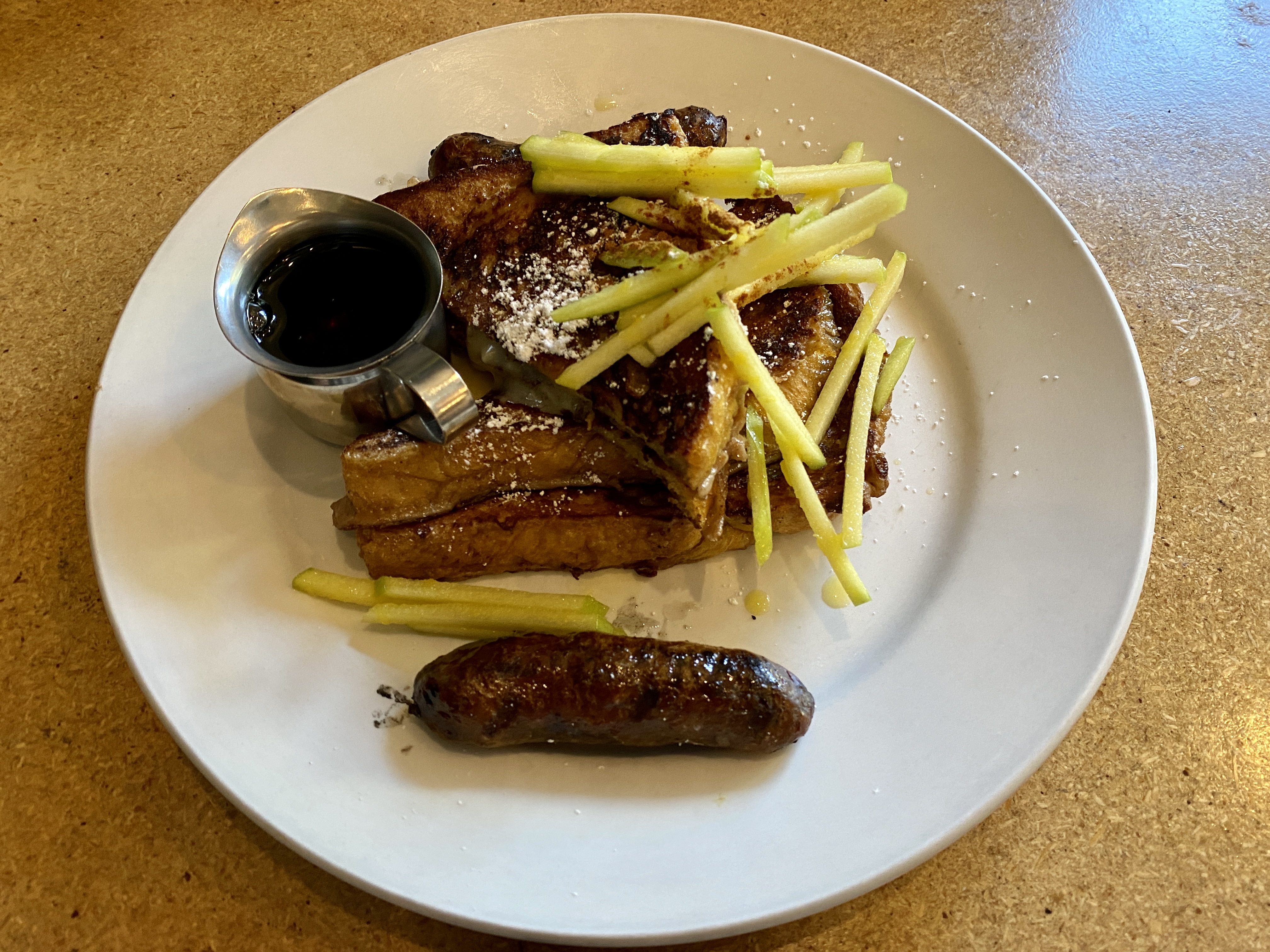 Another savory option is the tortilla espanola. It has nothing to do with Mexico or the American Southwest and instead is a mixture of layered potatoes and egg with a firm texture close to quiche. Like the crepes, it is accompanied by an arugula salad. Back on the sweeter side of breakfast, French toast comes in two varieties. A classic American-style Orchard French Toast is dusted with powdered sugar and enhanced with slivers of green apple. The pain perdu is a denser version made with banana bread topped with sliced banana and a drizzle of caramel.