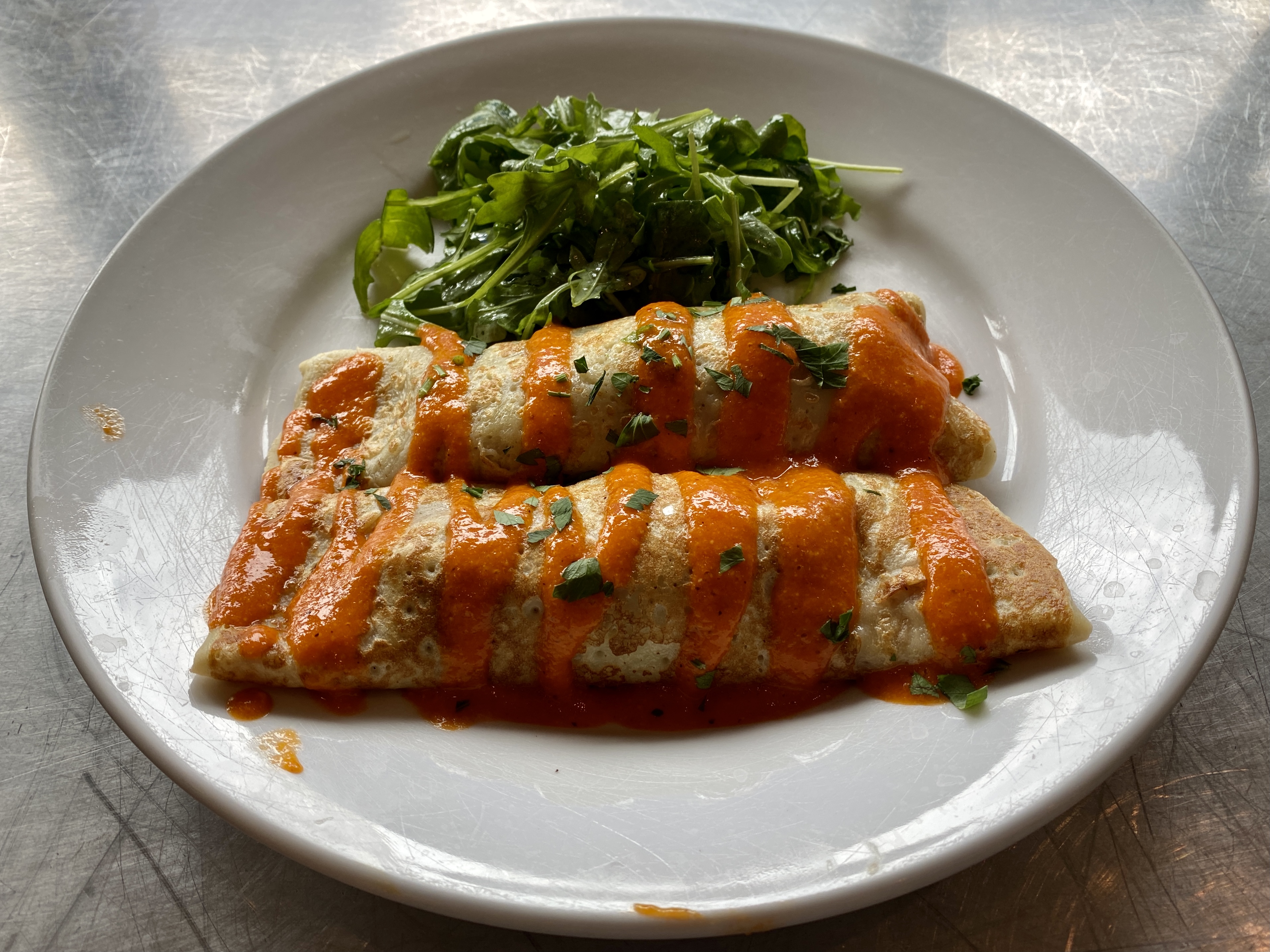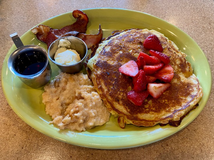 The entrees listed draw from a variety of influences from the Americas and Europe. Johnny cakes are a Caribbean variation of pancakes, also found in New England, in which cornmeal adds a bit of texture. They’re topped with sliced strawberries and paired with a serving of sweet rice cooked in coconut milk. Conventional pancakes, or the alternative of a waffle, are found in the Pawtucket West entree with two eggs and a choice of breakfast meat. A thinner version of a pancake is found in the savory crepes filled with chicken, scrambled eggs, chard, and fontina.