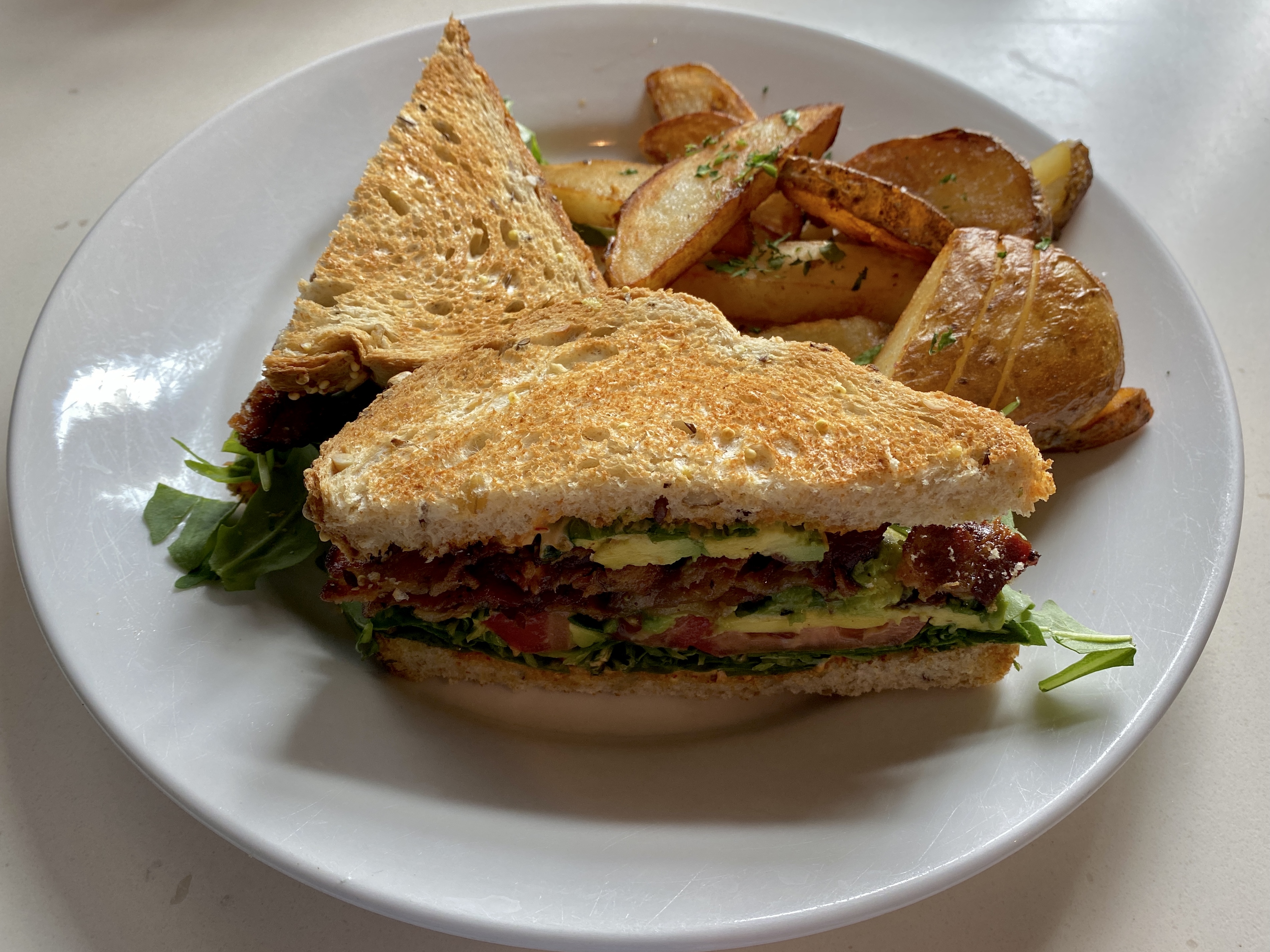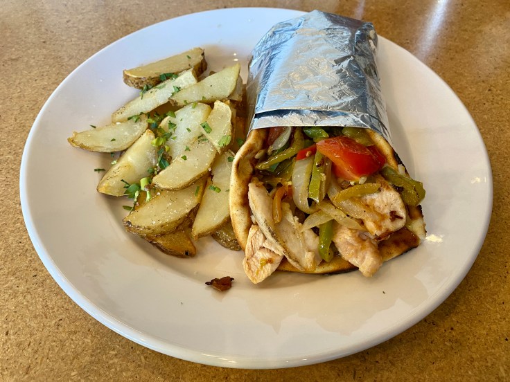 A lunch-oriented section of the menu is short with just four items and is not served at all on weekends. Nevertheless, it maintains the same cross-cultural themes as the breakfast offerings. A Clyde Street cobb sandwich (geographical reference unknown) is essentially a well-crafted BLT on toasted multigrain augmented with guacamole and bleu cheese mayonnaise. The chicken fajita pita is replete with grilled onions and peppers intermingling with melted mozzarella and chipotle aioli. Both of these lunch items are served with roasted potato as a side dish.