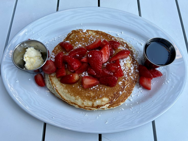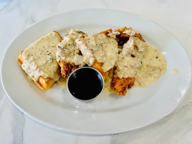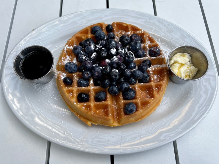 For those who prefer a more carb-oriented breakfast, Morning Squeeze offers the classic trinity of pancakes, waffles, and French toast. Of the three, the pancakes are the most traditional. Three fluffy, semi-sweet cakes can be ordered plain or accessorized with berries or bananas. The Belgian waffle also lies in familiar territory, but the restaurant’s take on chicken and waffles is creative with a half waffle served in an alternating pattern with boneless fried chicken and topped with a sausage gravy. It’s smaller than a typical serving but also more flavorful.