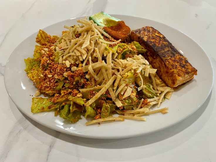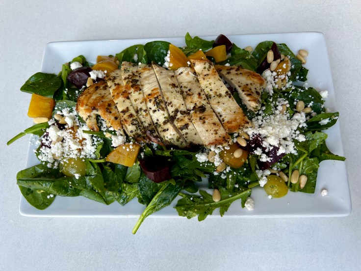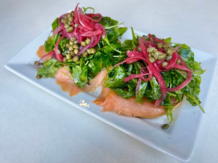 If that all sounds rather sweet, the most savory of the breakfast items is the restaurant’s take on the classic bagels and lox combination. The plain bagel at the base of this small mountain is topped with abundant sprigs of arugula, pickled red onions, cream cheese, slabs of smoked salmon, and innumerable capers. Of course, there are even more savory items within lunch-oriented categories of salad and sandwiches. The blackened salmon salad features not only the expected fish, but also pepitas and an avocado half with a dusting of spice.