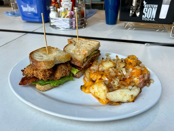 Sandwiches include the Frisky Chick with fried chicken, bacon, lettuce, and avocado on toasted sourdough bread.The Reuben is also worthwhile, but a bacon, lettuce, and tomato sandwich is less successful due to being out of proportion with too much bacon and too little lettuce and tomato to balance it. Think of it as a Blt instead of a BLT. All sandwiches come with a choice of sides, including a small salad, fruit, or fries. The best option is breakfast potatoes, particularly when ordered with an optional upgrade of sautéed onions and melted cheese on top.