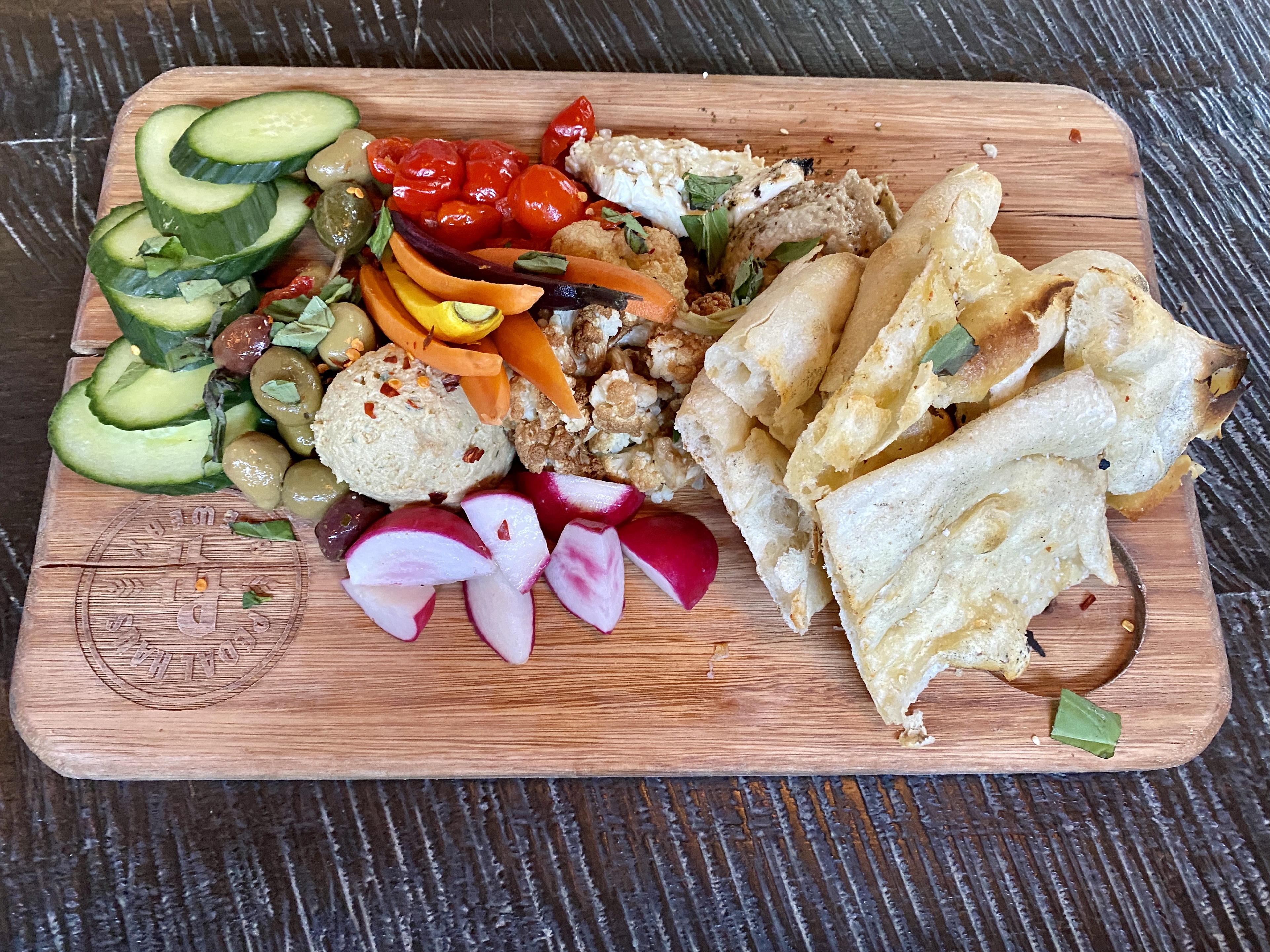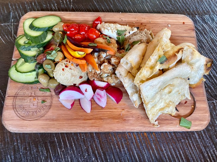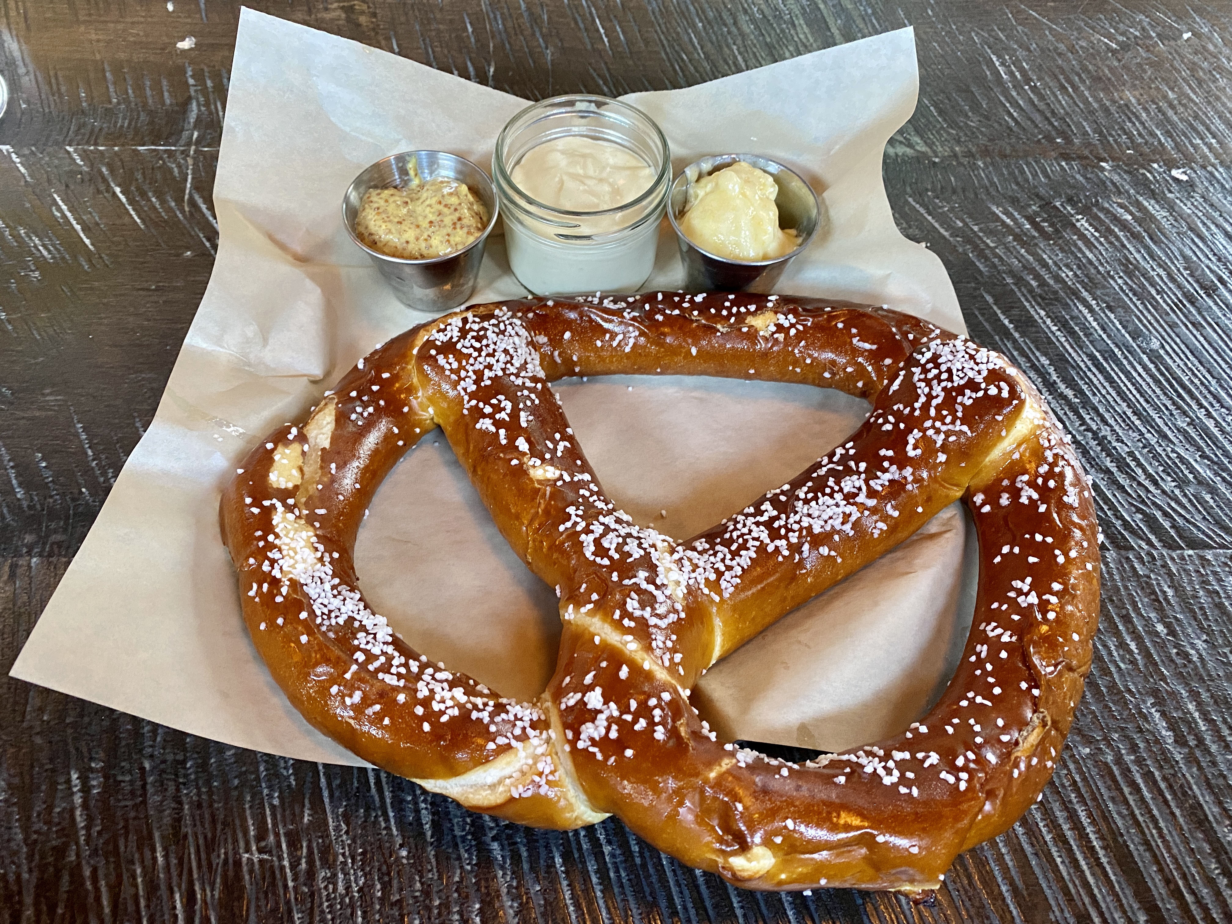 The food at both locations leans into pub traditions, sometimes with a little flair, but typically within a sports bar menu comfort zone. The Bavarian pretzel is hefty but airy and not not too heavy. It comes with the usual mustard and some butter with beer cheese available for a couple of dollars more. The Mediterranean board is also enormous and can easily be shared by two or more people. Smoky baba ganoush and lemony hummus are presented as dips for slabs of flatbread, along with cucumbers, radishes, carrots, roasted cauliflower, olives, and mild peppers.