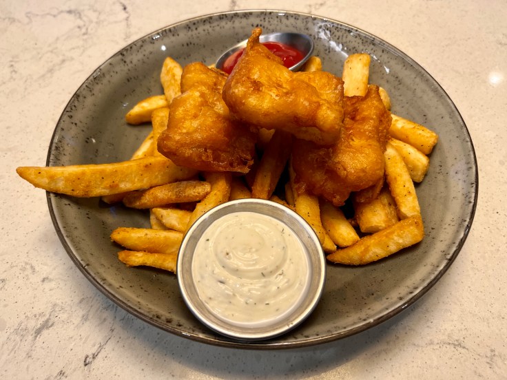 Salads include a namesake Adams Table salad with a hearty mix of mesclun greens, roasted corn, heirloom tomato, cucumber, avocado, and Marcona almonds tossed in a buttermilk ranch dressing. The steak salad is actually a lighter entree with a slight Southwestern touch from tomato, cucumber, and corn topped with tortilla strips and dressed in a cilantro lime vinaigrette. Entrees begin with fish and chips made with a locally sourced beer in the batter, yielding slabs of cod that are tender, moist, and flaky. They’re accompanied by a house tartar sauce and fries.