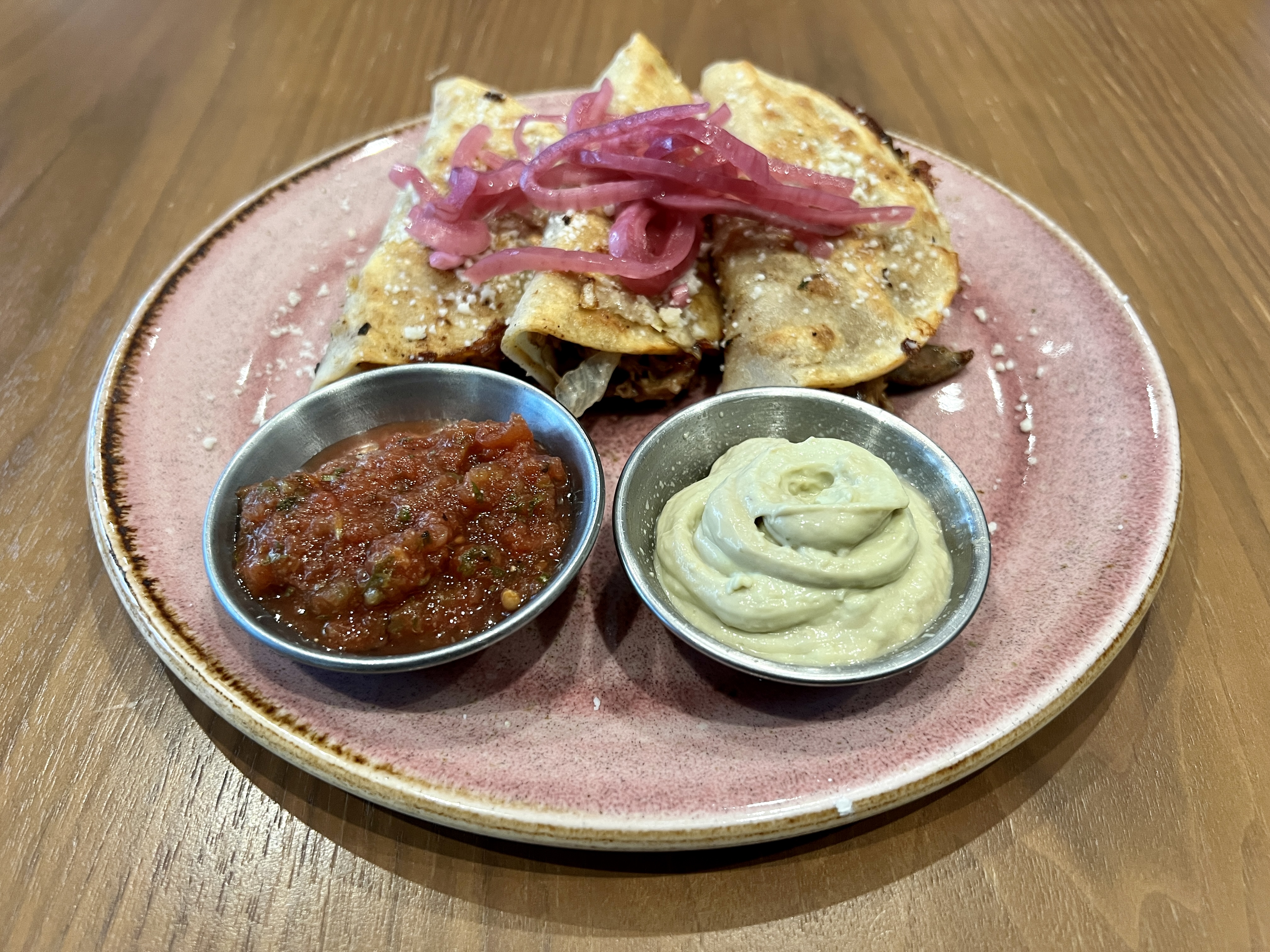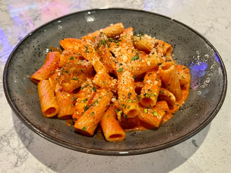 Carnitas tacos are three specimens of tacos dorados, tortillas that are stuffed with pork and then fried whole. They’re topped with pickled onions and served with a mild red salsa and an avocado crema. Rigatoni vodka is a simple but effective preparation topped with grated parmesan cheese and grilled chicken. In the evening, there are a few “larger plates” featuring short rib, roasted chicken, and seared salmon. For the most part, however, it’s an all-day menu with a common continuum of foods offered for lunch, dinner, and happy hour in between.