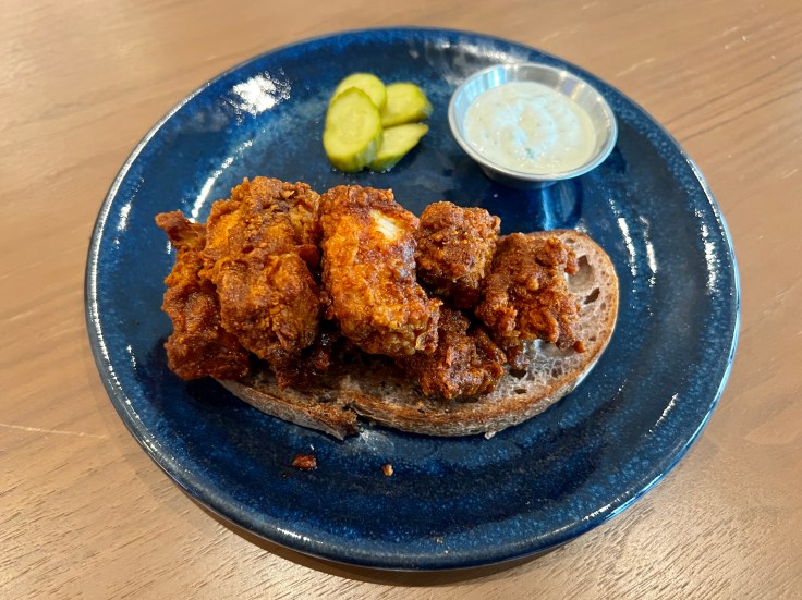 The “For the Table” section of the menu focuses on shareable starters, many discounted at happy hour and easily combined to create a meal on their own. The desert hot chicken bites have a medium-hot spice level, and refreshingly, the heat comes from the coating, not a sauce. They’re paired with sweet pickles and a slice of Noble bread. The roasted cauliflower has bursts of flavor from red pepper hummus and pickled fresno peppers, along with some crunch from Marcona almonds. Parmesan garlic fries are simple, straightforward, and satisfying.
