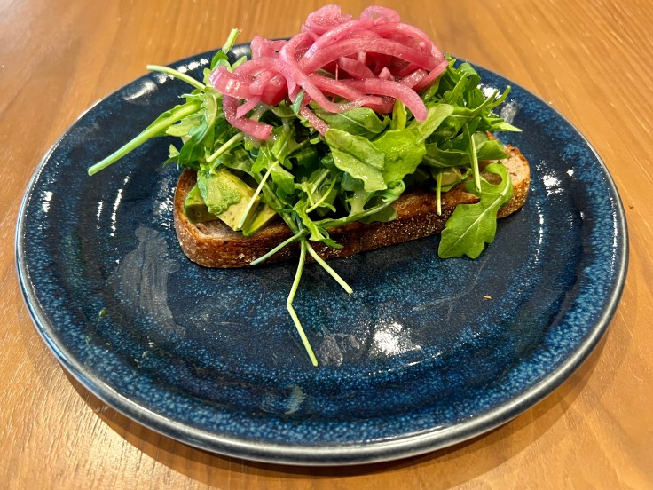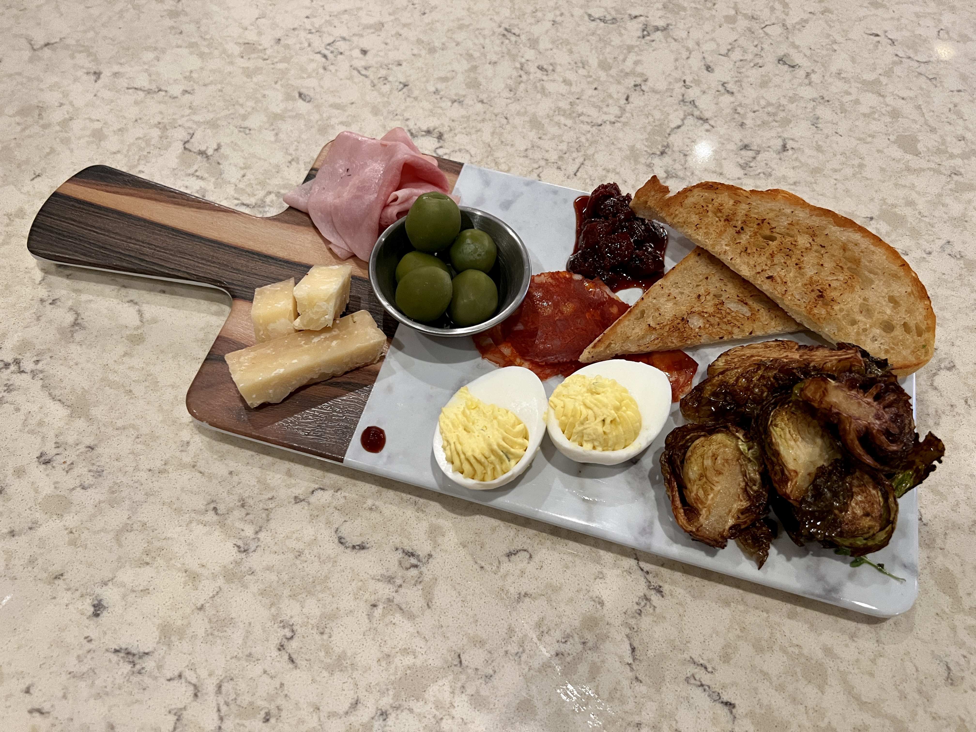 The avocado toast tops Noble bread with chunks of avocado, leaves of arugula, and pickled onions. It might have benefited from more mashing of the avocado to make a more coherent dish. This version falls apart a little too easily, making it as messy as it is tasty. A chef’s board is the Adams Table take on increasingly popular charcuterie platters, and this one features yet more Noble bread with an intense sour cherry jam, marinated olives, age white cheddar, deviled eggs, crispy Brussels sprouts, and slices of both rosemary and chorizo de bilbao.
