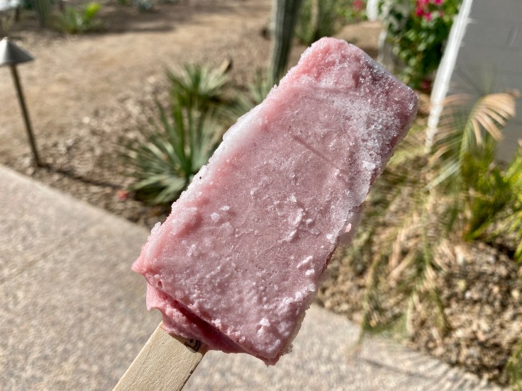 The popsicles are sold in a shop called Pop Stand, which is really just another name for the hotel’s small lobby. The check-in desk at this recently renovated hotel is in the center of the room with a small boutique selling vinyl records and artsy gifts from local merchants on one side and freezer cases full of frozen treats on the other. The hotel is on the north side of Camelback Road between the stations at Central and 7th Avenue on the B Line. A convenient bike rack is found right outside the entry to the hotel lobby and popsicle shop.