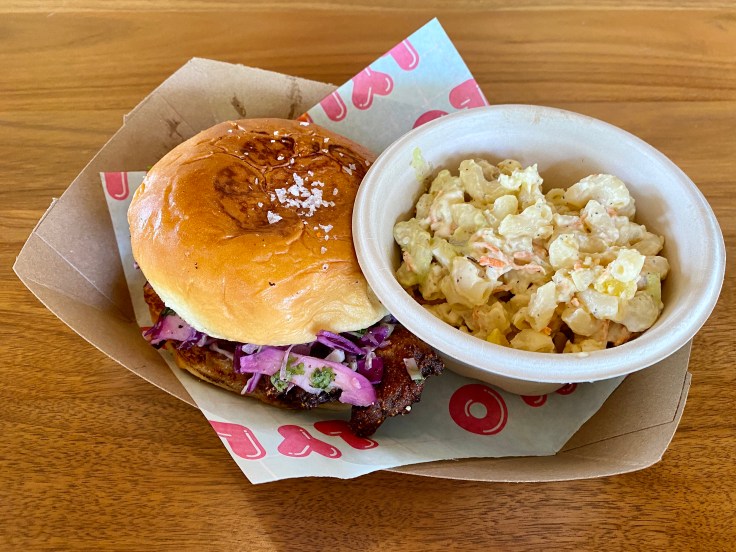 Under the second category of “bigger bites,” the lightest item is a crispy noodle chicken salad, a large bowl of greens topped with grilled chicken, julienned vegetables, peanuts, and strips of crisp noodles. There’s a hamburger and a hot dog, both with Asian-influenced accoutrements, but the standout handheld here is the mochiko fried chicken sandwich. A poultry breast is breaded with a slightly sweet rice flour and then served in a potato bun with toppings of spicy mayonnaise and peanut slaw and a side of the Hawaiian plate lunch standard, macaroni salad.