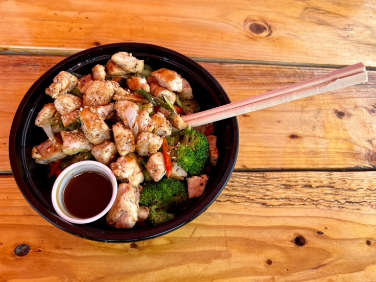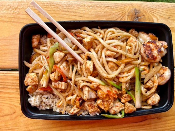 The menu features six sauces, sometimes used during cooking and at other times offered as sides for dipping or mixing food. The creamy, slightly hot 666 sauce shows up in the spicy shrimp bowl with grilled crustaceans and vegetables over thick and slippery udon noodles instead of the default starch of fried or white rice. The same sauce is used successfully in the Blazing Chicken with grilled poultry and diced bell peppers. The teriyaki bowls benefit from the familiar sweet and salty flavors of that sauce, as well as a generous dusting of sesame seeds.