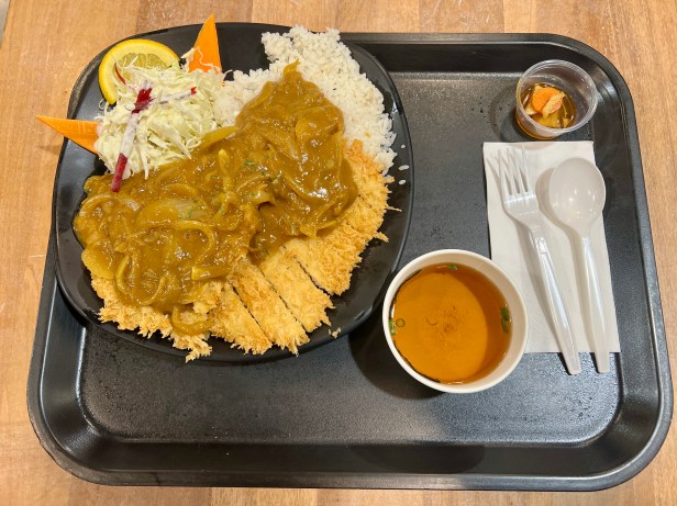 Maisen Katsu’s location within H Mart puts it across the street from Sycamore/Main station on the A Line with bike racks found near the grocery’s west entrance. Maisen Katsu is found in the back of the shared dining area, on the right if entering, next to the Snow Time frozen dessert shop. The concise menu is displayed over the counter with photographs and descriptions of the dishes available, and customers are informed when their orders are ready via the same automated public address system used by almost all of the booths in the food court.
