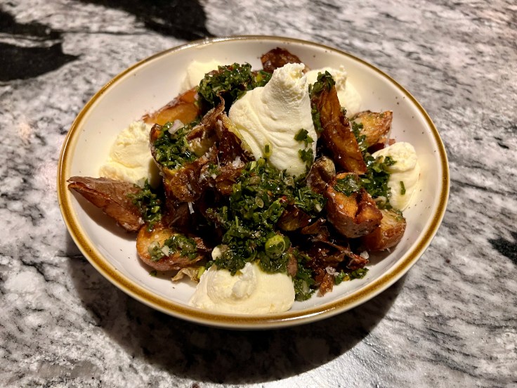 The menu, like most of the aesthetics, is designed to recall an earlier era, both in terms of food and beverage selections. The cuisine might be described as classic American with some contemporary updates and an interesting focus on foams and creams. That approach is evident in the appetizer of roasted potatoes and artichokes, in which mascarpone cheese, maybe a bit too much of it, functions as an effective counterpoint to the salty umami of chimichurri. A lobster roll with fries is unexpectedly present among the starters, but it’s really a meal for one by itself.
