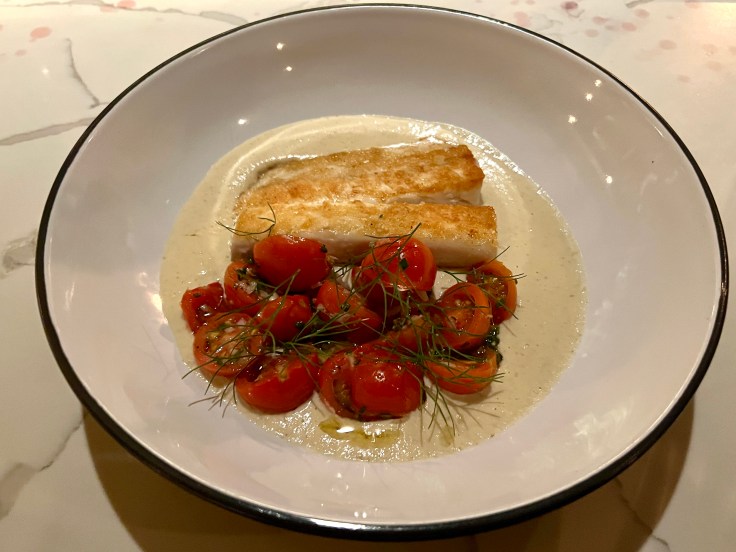 Old-school entrees with updated flair include a veal schnitzel with a mustard cream sauce and a roasted half chicken with celery root puree. A meatless pasta entree of wild mushroom taglierini is seasoned with abundant sprigs of tarragon. A pan-seared sea bass entree incorporates a pleasing contrast between a smooth cream sauce, tangy heirloom tomatoes, and flavorful springs of fennel One entree that is now gone but not forgotten is the shrimp and grits, a successful rendition of this Southern classic that one can only hope will be resurrected soon.
