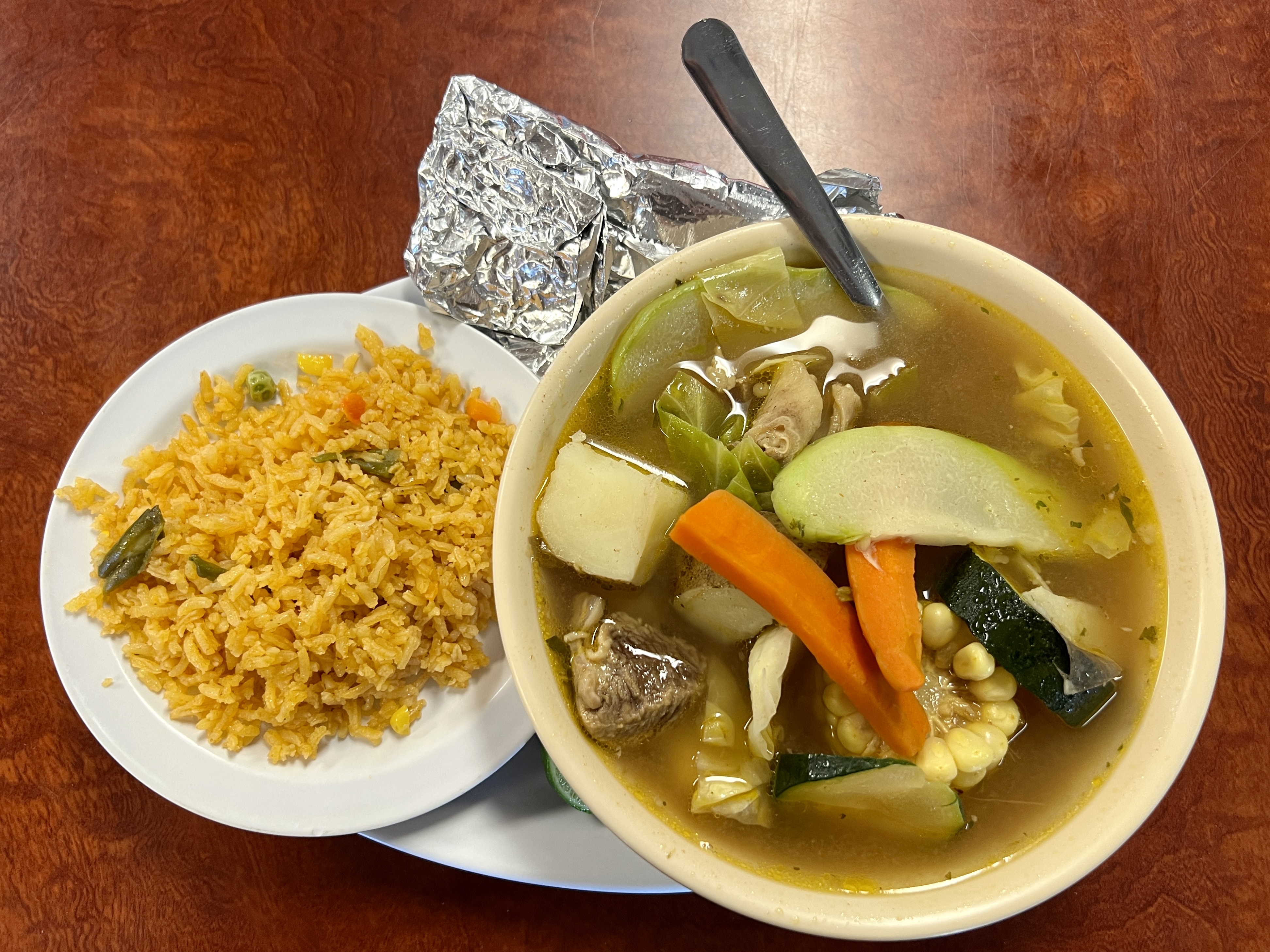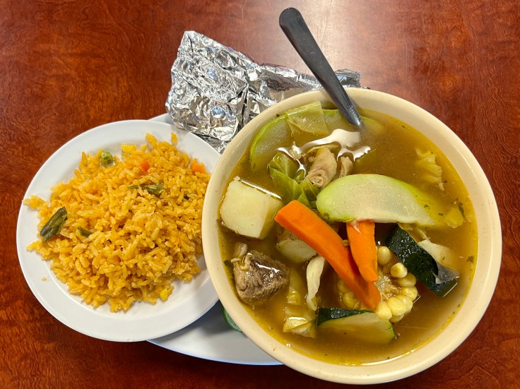 Tacos mi Ranchito serves a selection of soups as hearty entrees. Caldos of beef, shrimp, and siete mares (mixed seafood) are all available with generous hunks of protein served in a big bowl with potatoes, corn, cabbage, carrots, and two types of squash: chayote and zucchini. Rice and tortillas can be used to soak up the flavorful broth. The restaurant also serves menudo and pozole every day, rather than just on weekends. Mi Ranchito’s version of the latter is a red one with abundant tender pork and onions, cabbage, limes, and ultra-hot red salsa as garnishes.