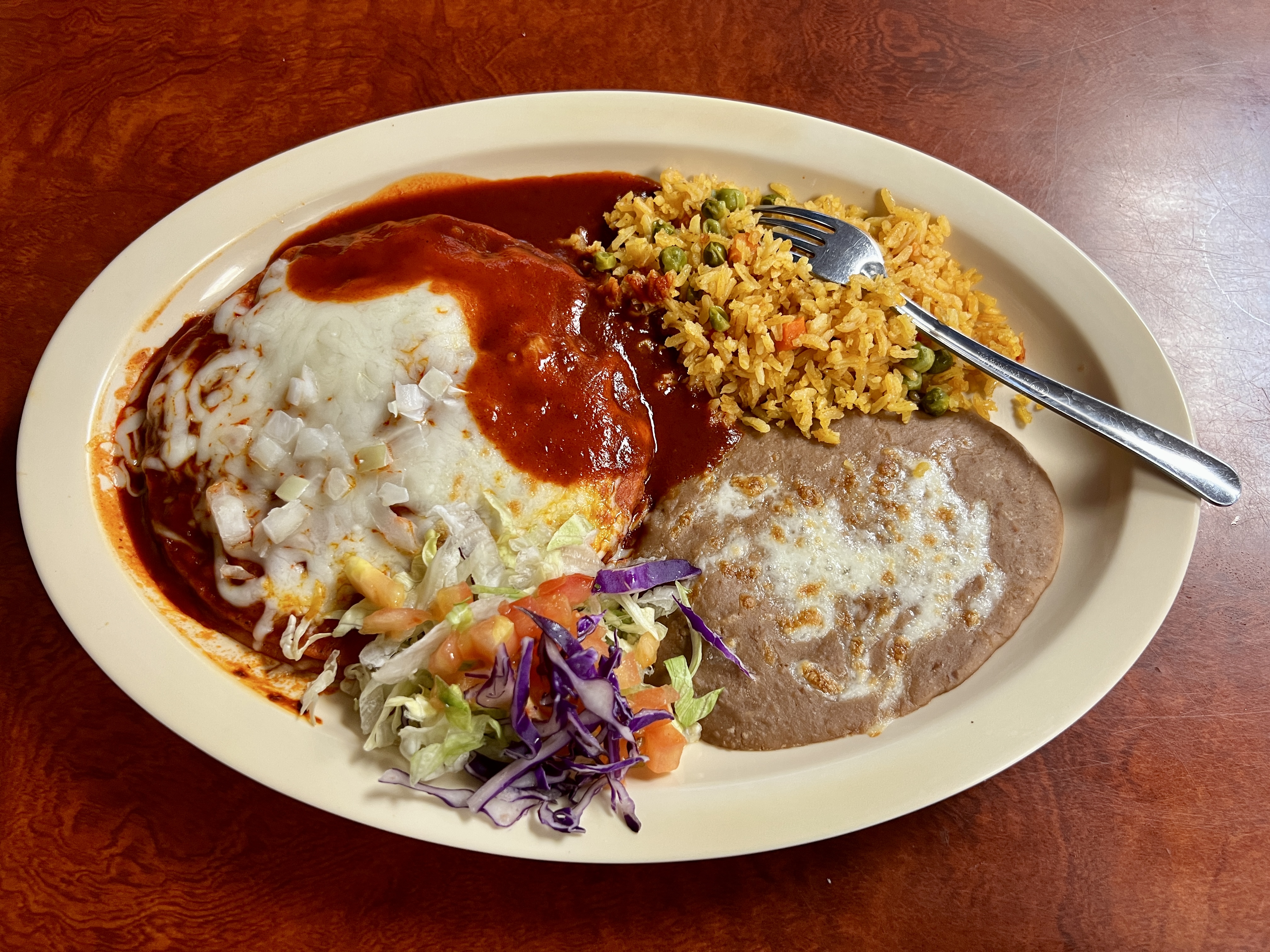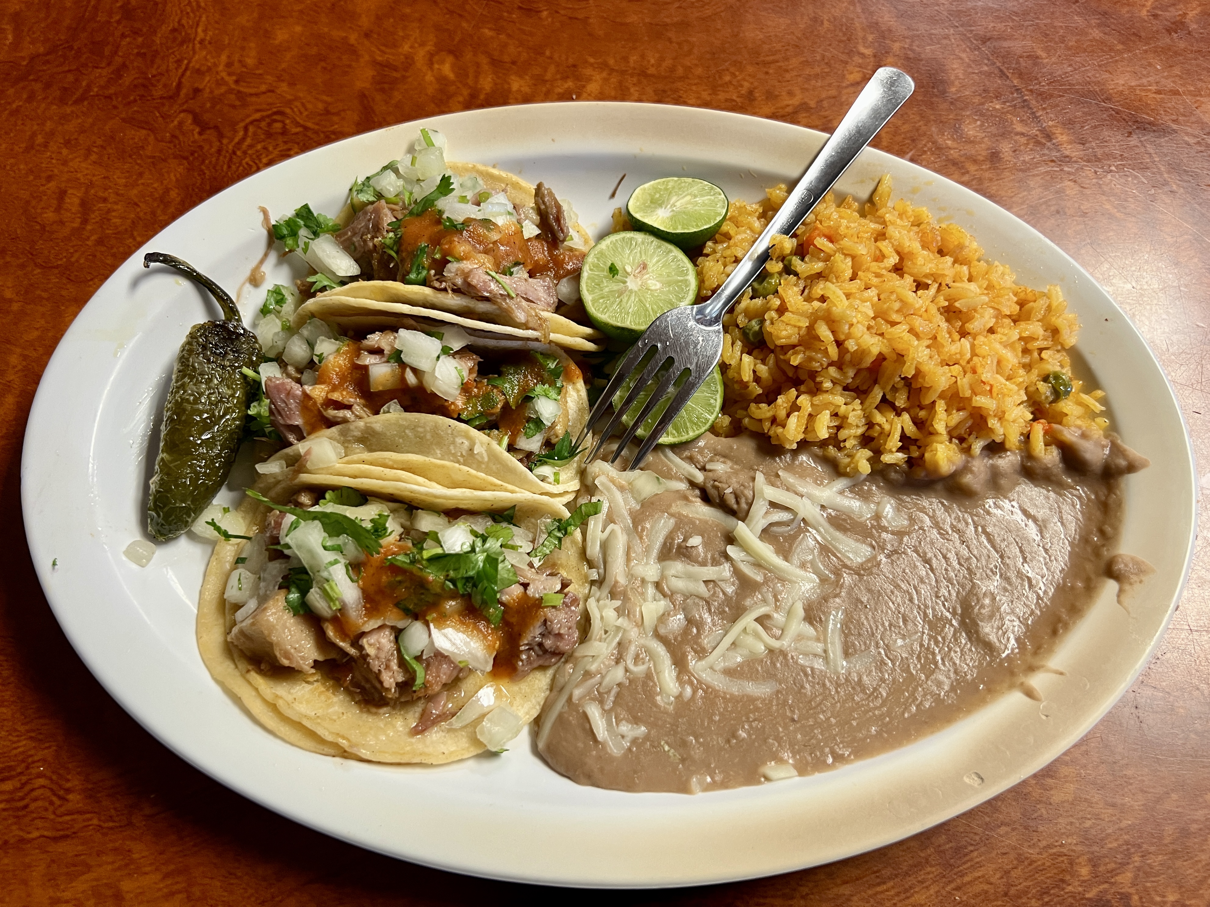 While the molcajete entrees are suitable for sharing, the parrilladas demand it. Priced for either two or three people, these are big platters with a choice of three meats, rice, beans, and tortillas for creating tacos at the table. Although there are no desserts listed on the menu and the staff do not routinely mention the possibility of them, an inquiry will reveal that flan, churros with ice cream, and rotating flavors of cheesecake are typically available for anyone with sufficient appetite left to enjoy them after a hearty meal of one of Taco mi Ranchito’s meaty entrees.