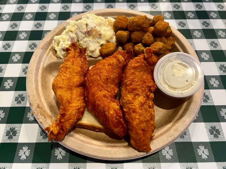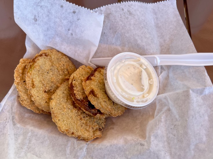 “Plates,” on the other hand, are pieces of chicken with the same sliced bread, as well as default side dishes of creamy coleslaw and slightly sweet baked beans. There is the option to substitute potato salad, fried okra, greens, or mac-and-cheese for either or both sides for a slight additional charge. The emphasis on fried foods that pervades the entrees is found also in the appetizer section of the menu, which includes shareable portions of fried pickles and fried green tomatoes in addition to a larger serving of okra. All come with ranch dressing for dipping.