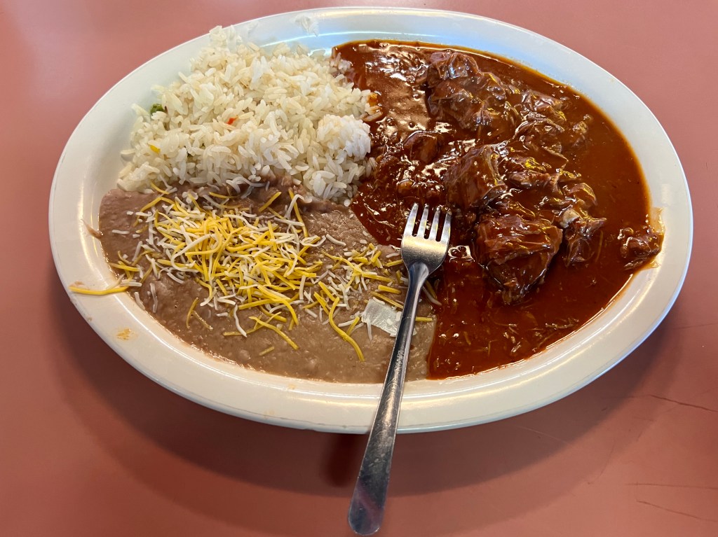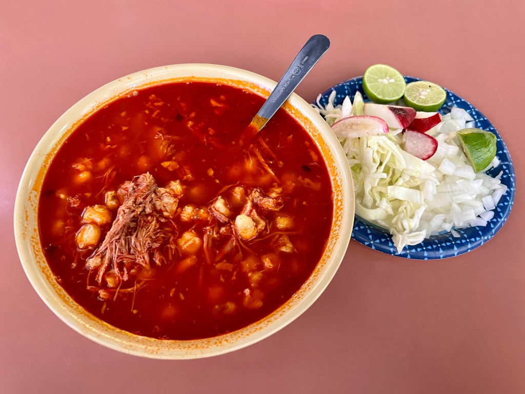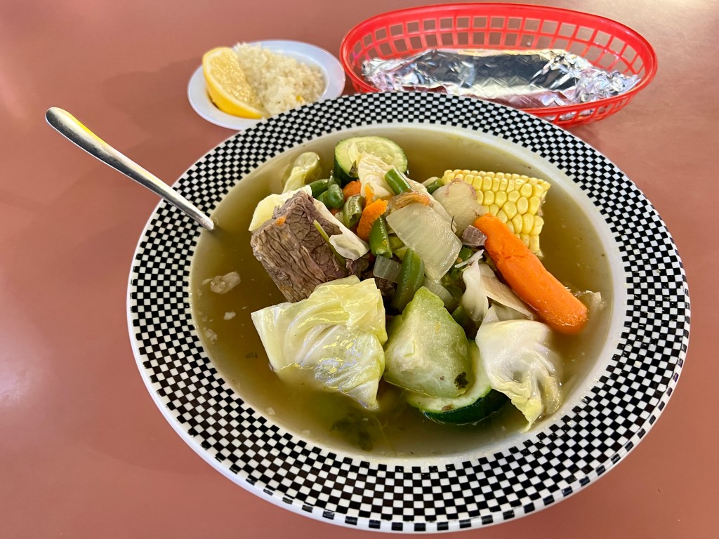 Soups and stews continue with additional meat sections. Cocido de res is a robust beef soup with cabbage, corn, carrots, and two types of squash in the broth. Rice and tortillas are served on the side to provide opportunities to absorb the liquid. La Olmeca also serves both menudo and pozole every day, not just on weekends like many other places. The restaurant’s version of the latter is a red version accessorized with cabbage, onions, limes, and radishes, along with a choice of tortillas, chips, or bread, and shakers full of dried oregano and pepper for seasoning.