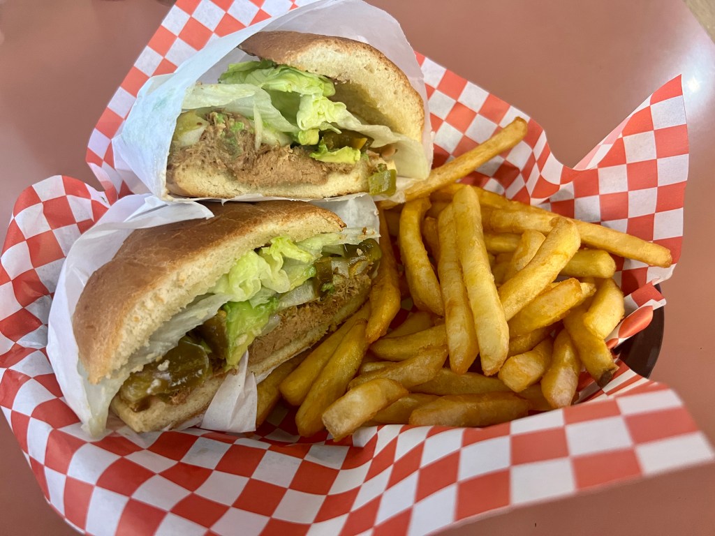 La Olmeca offers tacos individually or as a pair in a combination plate with rice and beans. The choice of meats includes carne asada, al pastor pork, carnitas, and chicken, and the format is simple: two layers of corn tortillas topped with the chosen protein, diced white onions, and minced cilantro. The same options present themselves inside a telera roll as part of a torta, a Mexican sandwich in which the meat is augmented with iceberg lettuce, jalapeños, onions, tomato, and avocado. These are sold a la carte, with a side for fries a worthy upgrade.