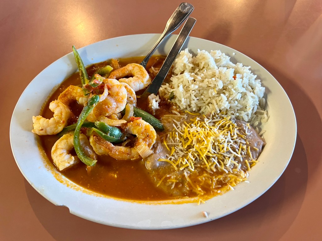 La Olmeca has a distinct section of its menu devoted to seafood with fish and shrimp tacos, as well as combination platters based on shrimp or fish filets. Camarones rancheros features big shrimp with equally big slivers of jalapeños in a zesty red sauce. Fish is available fried or served in a simple garlic sauce or seared in a la plancha preparation. There’s a generously sized shrimp cocktail on the menu, and ceviche is available atop two diameters of tostadas. Seafood is also served in big bowls of soup full of shrimp, fish, or the bounty of caldo siete mares.
