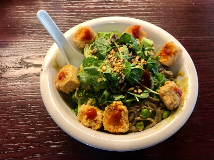 SoSoBa touts its status as “the non-stop noodle shop,” a reference to late night hours. There’s one menu in effect all day with some “halfy hour” 50% off specials during the slower time between lunch and dinner. Popular starters include fried cauliflower, a clever combination of a currently fashionable cruciferous vegetable and a sauce based on the American Chinese classic General Tso’s chicken. Instead of poultry, cauliflower florets are flash fried and coated with a sweet, salty, and slightly spicy sauce before being topped with sesame seeds and scallions.