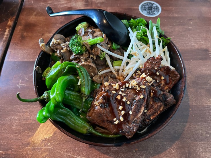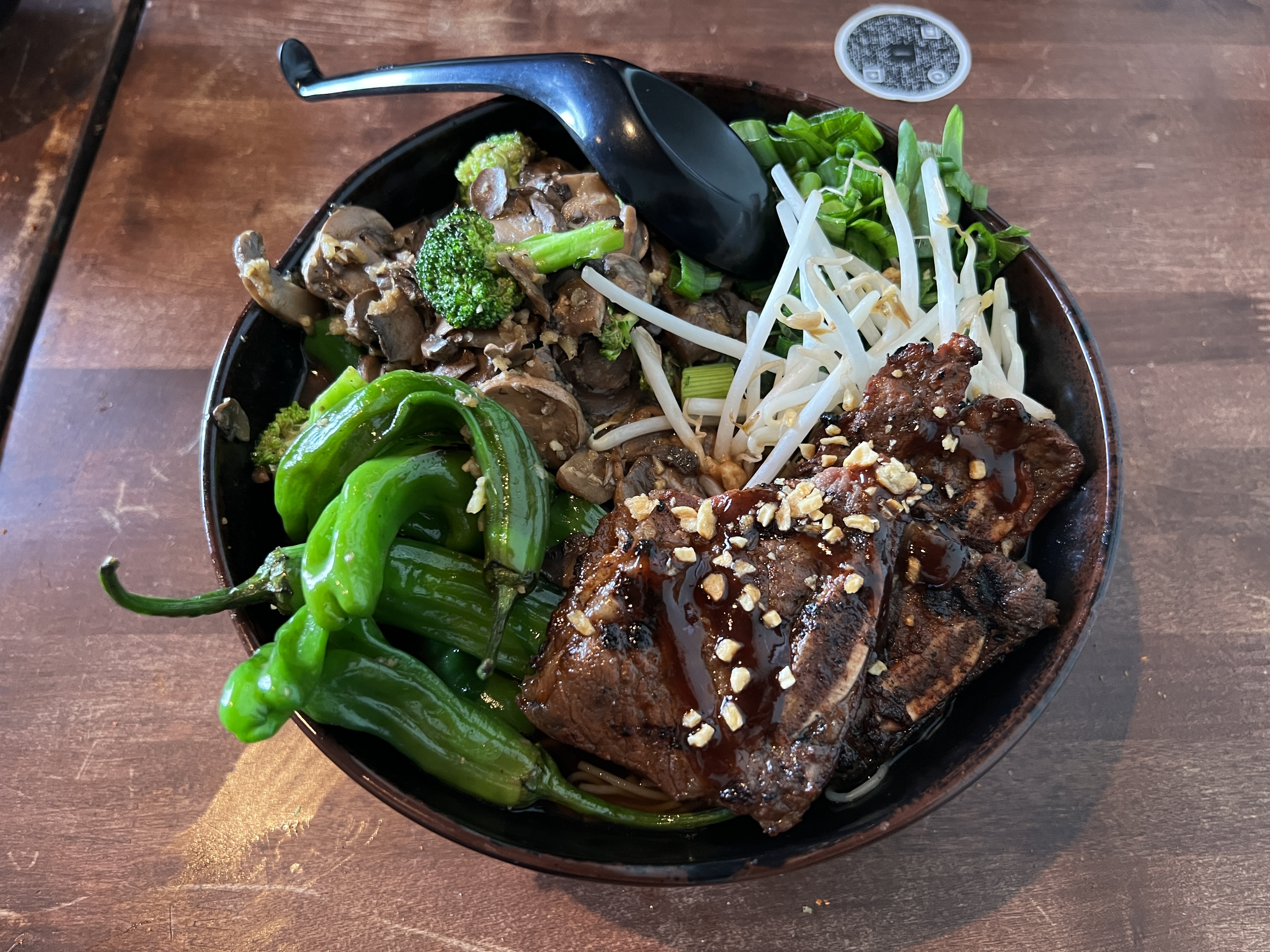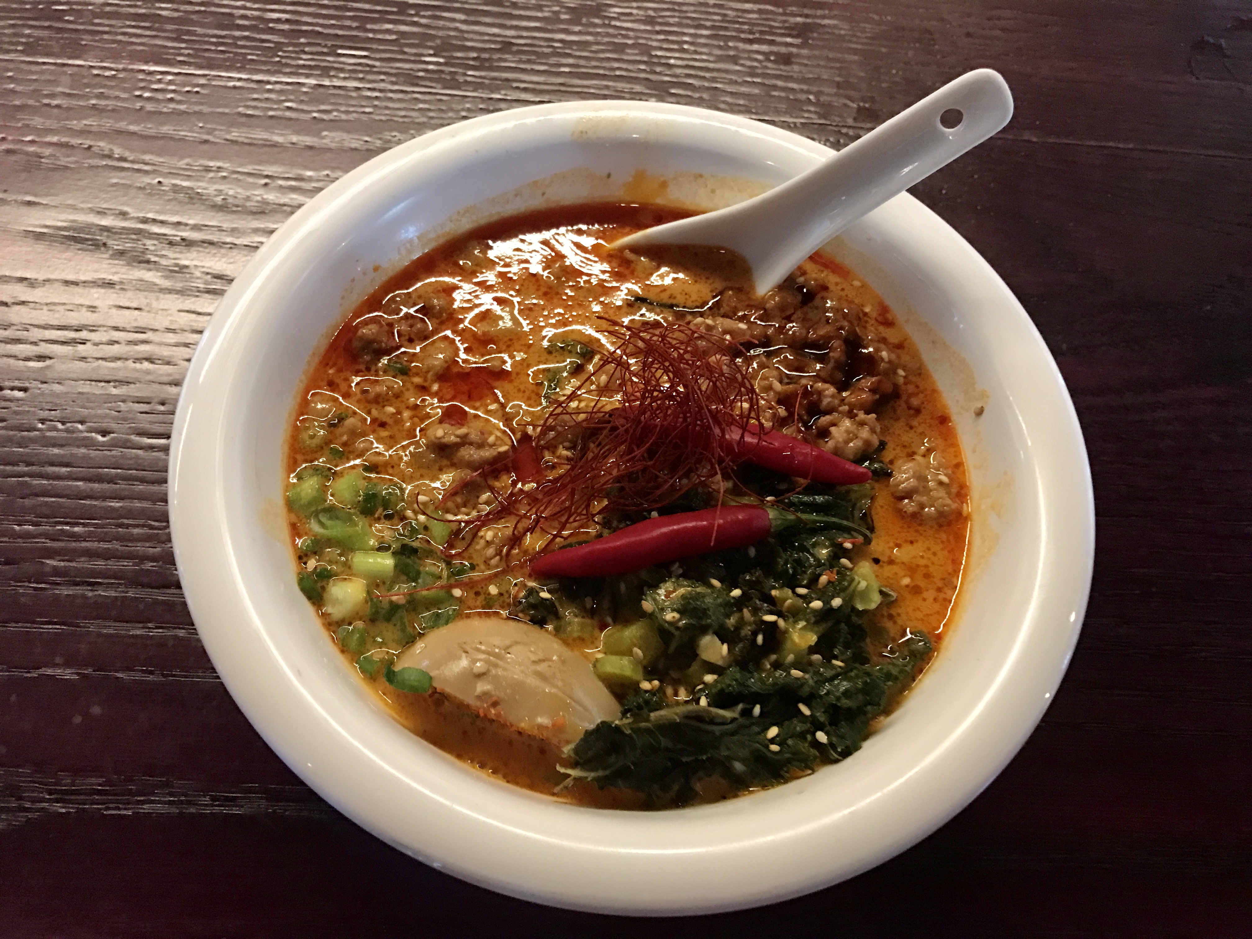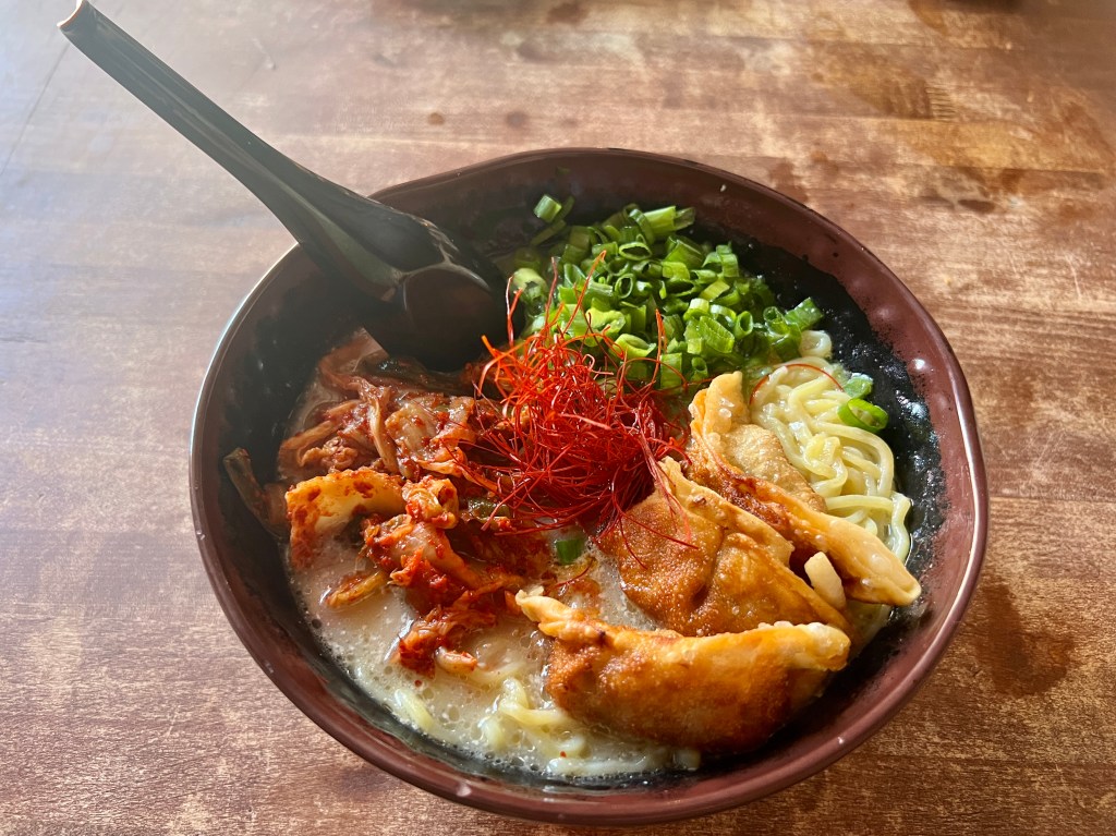 For those who prefer a little pork and a lot of flavor, the tantanmen is much like Chinese dandan, only with more broth.The noodles are paired with ground pork, bok choy, sesame seeds, and scallions in a tonkotsu broth. Sweet chile udon packs a little less heat.The default protein for this dish is fatty pork belly, but the kitchen will substitute other choices upon request. The katsu bowl consists of a breaded chicken breast atop ramen with corn and fish cake, and the Hostile Takeover involves bulgogi in a kombucha mushroom broth with vegetables and rice noodles.