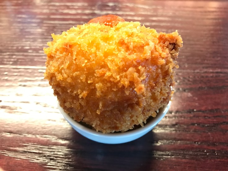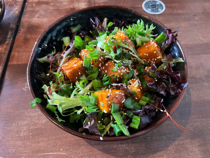Balls of Fire are a riff on the fried mac-and-cheese balls found at many restaurants. The layers of contrasting textures are familiar to anyone who has had arancini, Italian risotto balls. With some sriracha squirted into their molten interiors, they have plenty of heat, although maybe not as much complexity of flavor in comparison to some of the other dishes on SoSoBa’s menu. The tostada pairs a flat, crisp wonton-style layer with greens underneath and carnitas and fiery kimchi on top. Sweet chili tofu features crisp, seasoned bean curd, also served over a salad.