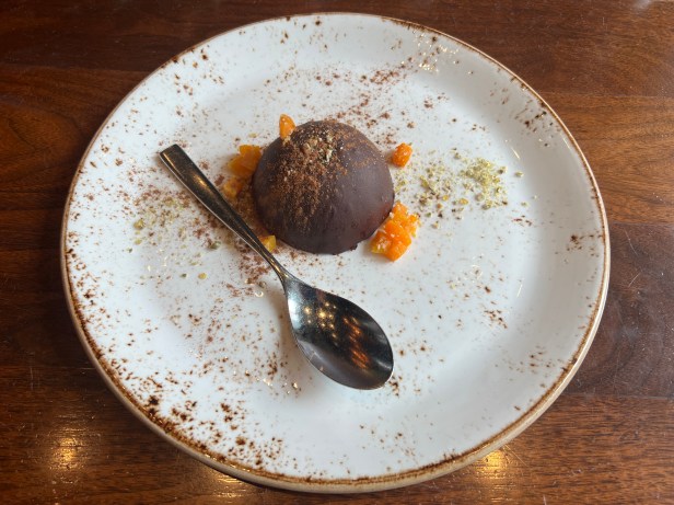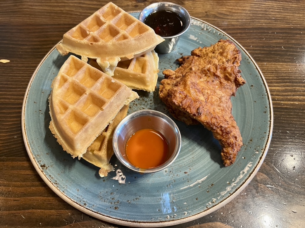 As a hotel restaurant, Blue Hound must also meet the morning needs of its visitors. Both a standard breakfast menu and weekend brunch are offered. On Saturday and Sunday, entrees like chicken and waffles with maple syrup and hot sauce or lemon pancakes topped with ricotta and berries expand upon the usual morning fare. At the other end of the day, desserts, generally sold only with dinner, include seasonal fare like a hemispherical pumpkin cheesecake encased in an outer shell of dark chocolate or cinnamon fried apples with a fritter-like consistency.