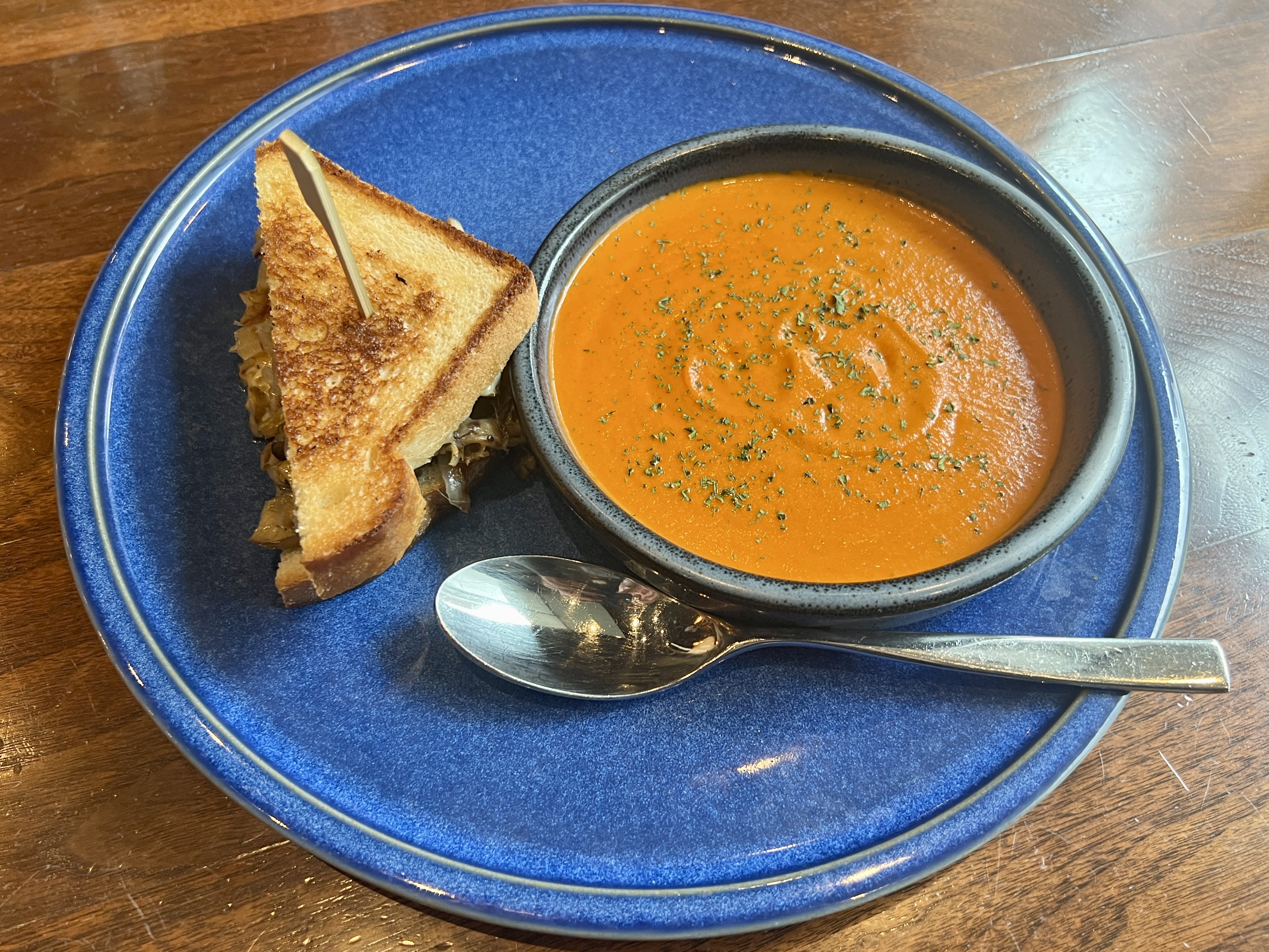 At lunch, another velvety soup is offered, currently a red pepper and tomato blend. It can be ordered with a half sandwich as part of a midday special, and the grilled cheese with added umami from mushrooms is a strong contender for the best match in this pairing. Other lunch options include sandwiches like a turkey club or a tarragon chicken salad BLT with a side of fries, fruit, or salad. Power bowls, which focus on combinations of healthful ingredients in a single vessel, have included duos such as shrimp and mango or chicken and quinoa.