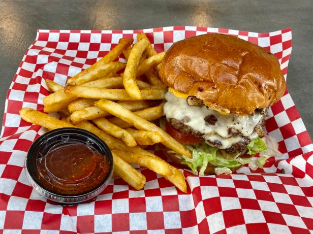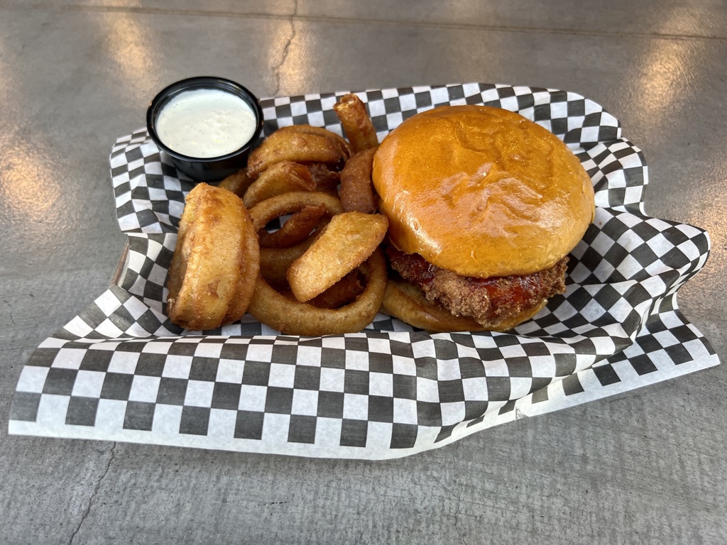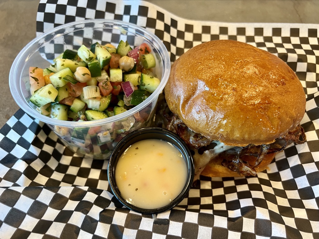 The burgers and sandwiches here are all served on a brioche bun a choice of sides: fries, onion rings, or side salad with chopped tomatoes and cucumbers that the menu describes as Mediteream pico de gallo. The basic burger is the Boom Boom burger with American cheese, lettuce, tomato, and a sauce of the same name. Other burgers add mushrooms and Swiss cheese, bacon, or pastrami. A Sun Devil hot chicken sandwich delivers the spice promised in its description, and roast beef and Philly-style sandwiches also do a capable job of filling the buns.