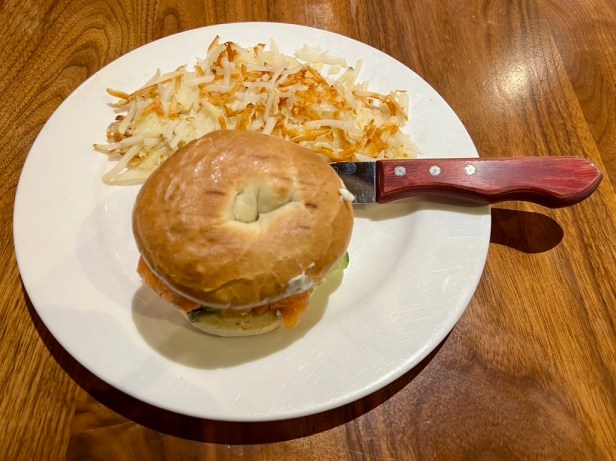 Elly’s approach to bagels and lox takes the form of a chewy sandwich rather than the usual open-faced presentation. Other breakfast sandwiches include a “Number Five” containing ham, cheddar, and a fried egg on a croissant and a standard sandwich of scrambled eggs, bacon, and American cheese on sesame brioche. These provide a bridge from breakfast to lunch, where selections like a mushroom patty melt or a Reuben offer additional choices. A standard cheeseburger has recently been augmented with special burgers featured in recent months.