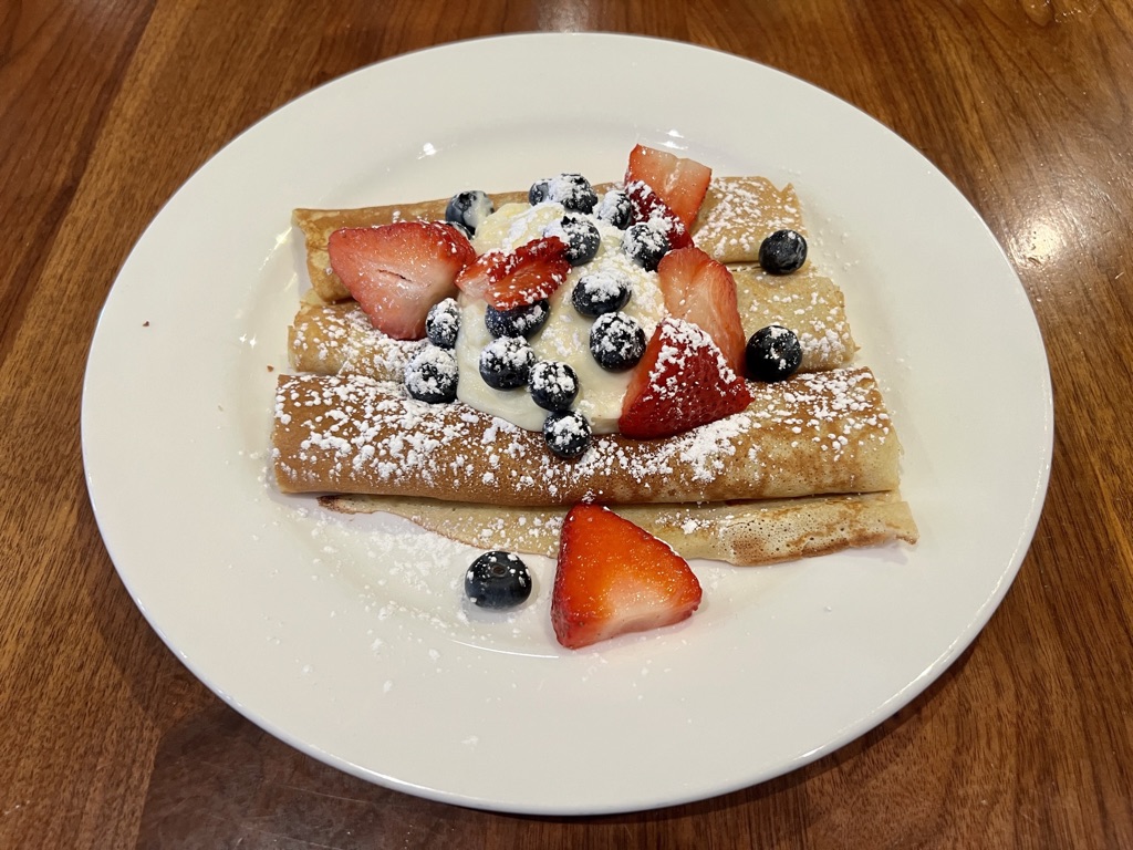 Of course pancakes alone do not typically sustain a breakfast/brunch menu, even in a place that has defined itself in terms of them. With that in mind, Elly’s also offers brioche French toast and Belgian waffles, again with the same topping assortments associated with the pancakes and crepes. For customers who favor a more savory approach to the morning, the restaurant serves a wide variety of omelets and egg dishes. The pancakes don’t disappear in this part of the menu, though. They’re offered as an included side with hash browns as the alternative.