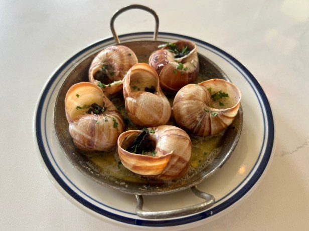 Salmon is offered not as a typical fish entree, but instead in the form of a rillettes, a preparation made via slow cooking in a method similar to a confit with the result being close to a pate, but with a more coarse texture. The spreadable salmon is presented with a crusty baguette, something that can and should be ordered on its own to go with just about everything on the menu, especially the escargots. Despite living on land, snails are classified as mollusks, often viewed as seafood, and they benefit from a simple, classic presentation in pools of garlic butter.