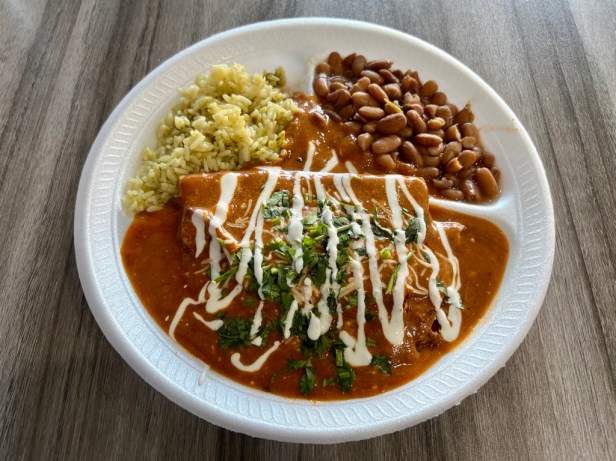 The ultimate creation at Maskadores is the shop’s bandera burrito. This meal is topped with both red and green sauces, a sprinkling of cheese, a dollop of guacamole, a little pico de gallo, and a central band of sour cream. All these ingredients are arranged in a vibrant tricolor pattern that evokes the Mexican flag. Another cylindrical structure, the taquitos combo, is like the bandera burrito in terms of being a moist and messy (in a good way) with layers of beans, minced cilantro, pico de gallo, and shredded cheese tiered and tossed on top of the rolled tacos.