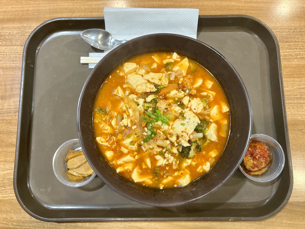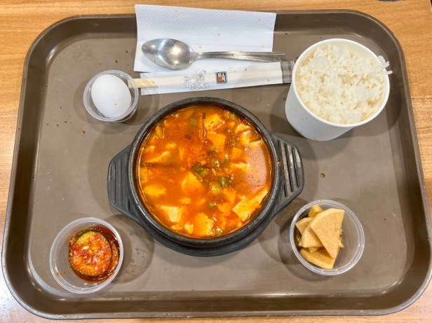 Sundubu, sometimes also romanized as soon dubu, is the restaurant’s signature dish. It’s a bowl of soft tofu in kimchi stew served bubbling and steaming. The soup is almost volcanic in its appearance, and caution is called for in carrying the heavy vessel on a tray from counter to table. The sundubu here is served with rice on the side or with either flat noodles or ramen mixed into the broth. The classic version with rice seems to best preserve the intensity of the dish by allowing customers to cool the stew gradually with successive spoonfuls of starch.