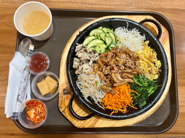 Regardless of the carbohydrate added to the bowl, customers also choose from one of approximately ten additional ingredients. Some choices are meats like beef or pork, others are seafood like clams or oysters, and a few are just more of some ingredients like tofu or kimchi that are already present. These choices are largely repeated with two bibimbap entrees. One is a straightforward mix of rice, vegetables, and a protein with a fried egg on top. The other is a stone bowl bibimbap, a presentation which allows a layer of crisp rice to form on the bottom.