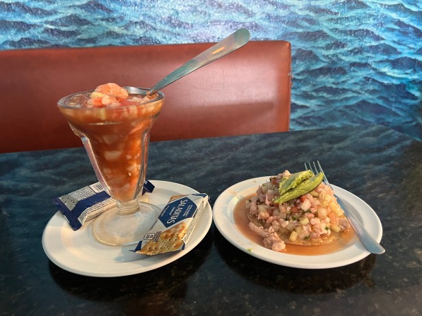The cocktails are available in bigger sizes of medium and large, allowing them also to function as a full meal, particularly when paired with the accompanying Saltine-style crackers. They all contain abundant shrimp, octopus, or a mix of seafood in a tangy sauce with tomato and a bit of shrimp extract for a briny flavor, as well as chopped cucumbers in the vessel and pieces of avocado on top. If ordering one of these cocktails, make sure to dip the spoon all the way to the bottom of the glass to find extra seafood that may be hiding in the depths of the narrow stem.