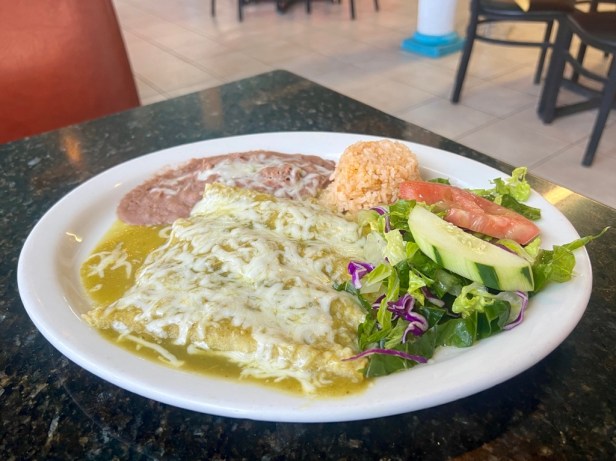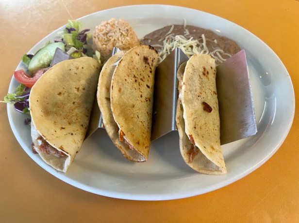 Tacos are not the main emphasis at Las Glorias, but a platter of three with rice, beans, and a small salad occupies a central place on the menu. The filling choices are a plain breaded fish, a similar format for shrimp, and, most interesting of all, smoked marlin machaca. The last item is intensely flavorful without being overtly fishy in taste. Among the enchiladas, the standout filling is crab. Three rolled tortillas are filled with crustacean meat and covered in a salsa verde with a moderate spice level that enhances the seafood flavor without overpowering it.