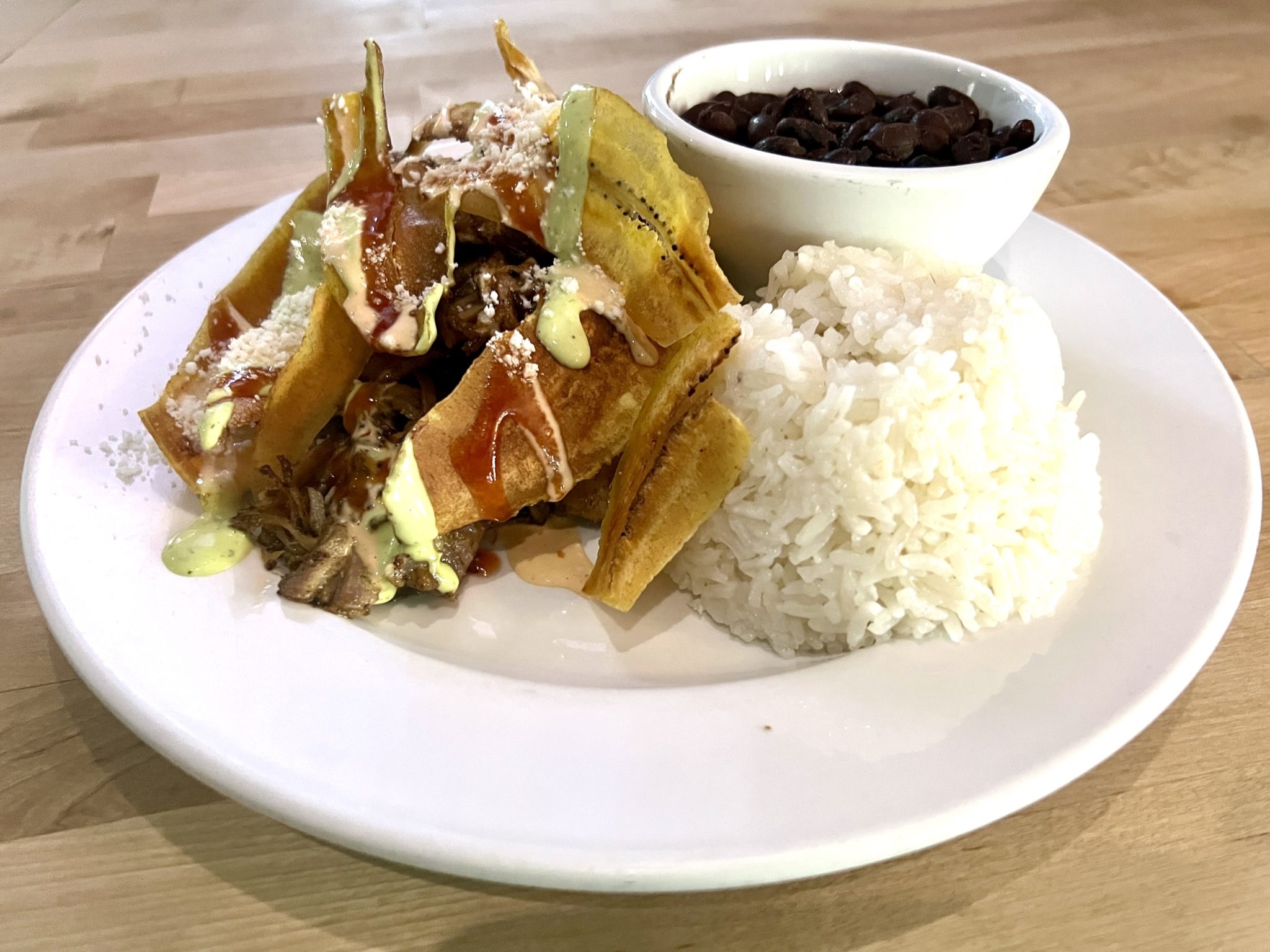 While most of Que Sazon’s menu is built around small bites designed for sharing and remixing into different combinations, the restaurant does offer some full entree plates. El Duro (loosely translated as “the hard one” or “the greatest”) is tender pork interlaced with crisp plantain planks and served with black beans and rice. Although its flavor is mild, asking for some hot sauce yields both red (medium) and orange (very hot) options. Similarly presented entrees are available with chicken and tofu as alternative proteins. All can be reinterpreted as burritos.